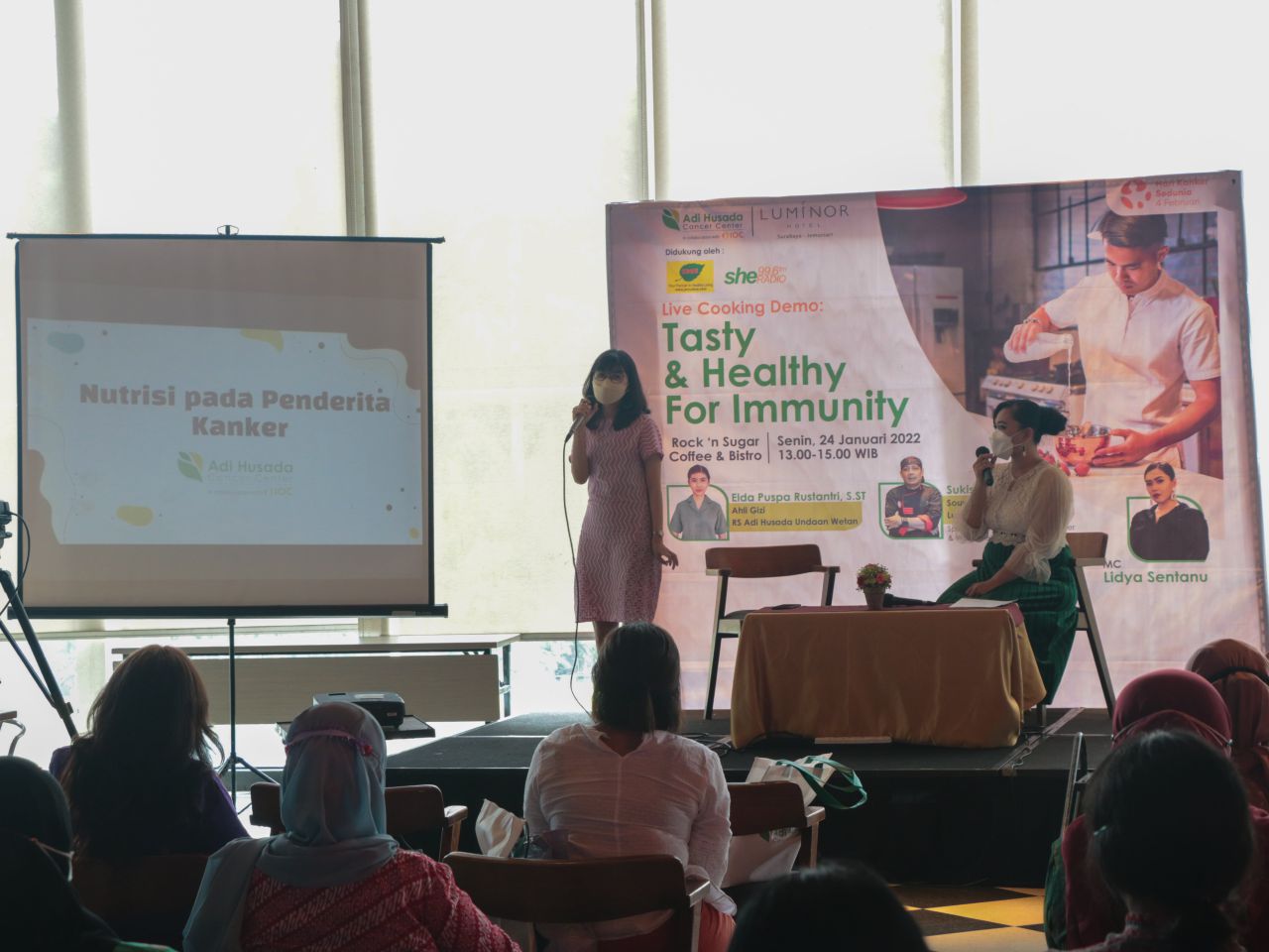 Selain demo memasak, ada juga talkshow berupa edukasi seputar makanan sehat dan gizi seimbang sebagai upaya pencegahan kanker yang dibawakan oleh Ahli Gizi Adi Husada Cancer Center.