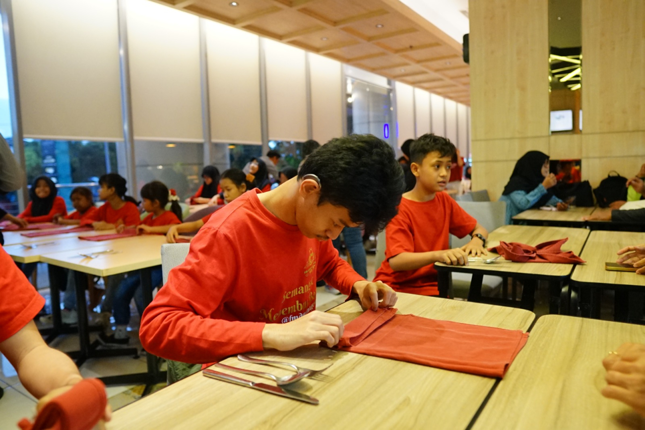 Program ini menghadirkan pelatihan keterampilan dasar di bidang hospitality berupa table setup dan napkin folding, yang diikuti oleh 28 siswa dari Sekolah Fira Model Disabilitas (FMD). Orang tua peserta juga turut diundang untuk memberikan dukungan secara langsung.