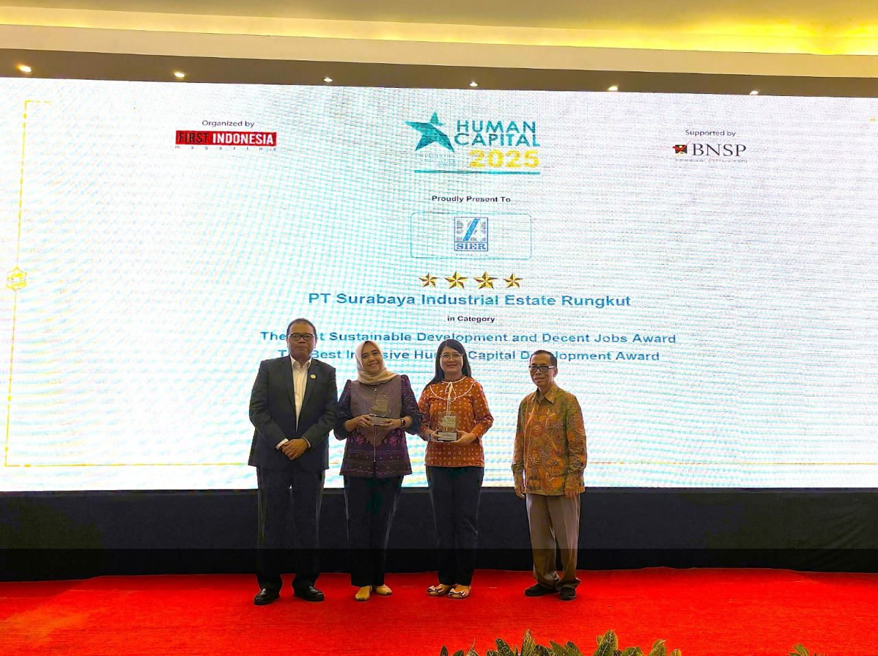 Ketiga penghargaan tersebut adalah The Best Sustainable Development and Decent Jobs Award Bintang 4, The Best Inclusive Human Capital Development Award Bintang 4, serta The Best Human Capital Leadership Award yang dianugerahkan kepada Plt Direktur Utama PT SIER, Rizka Syafittri Siregar.