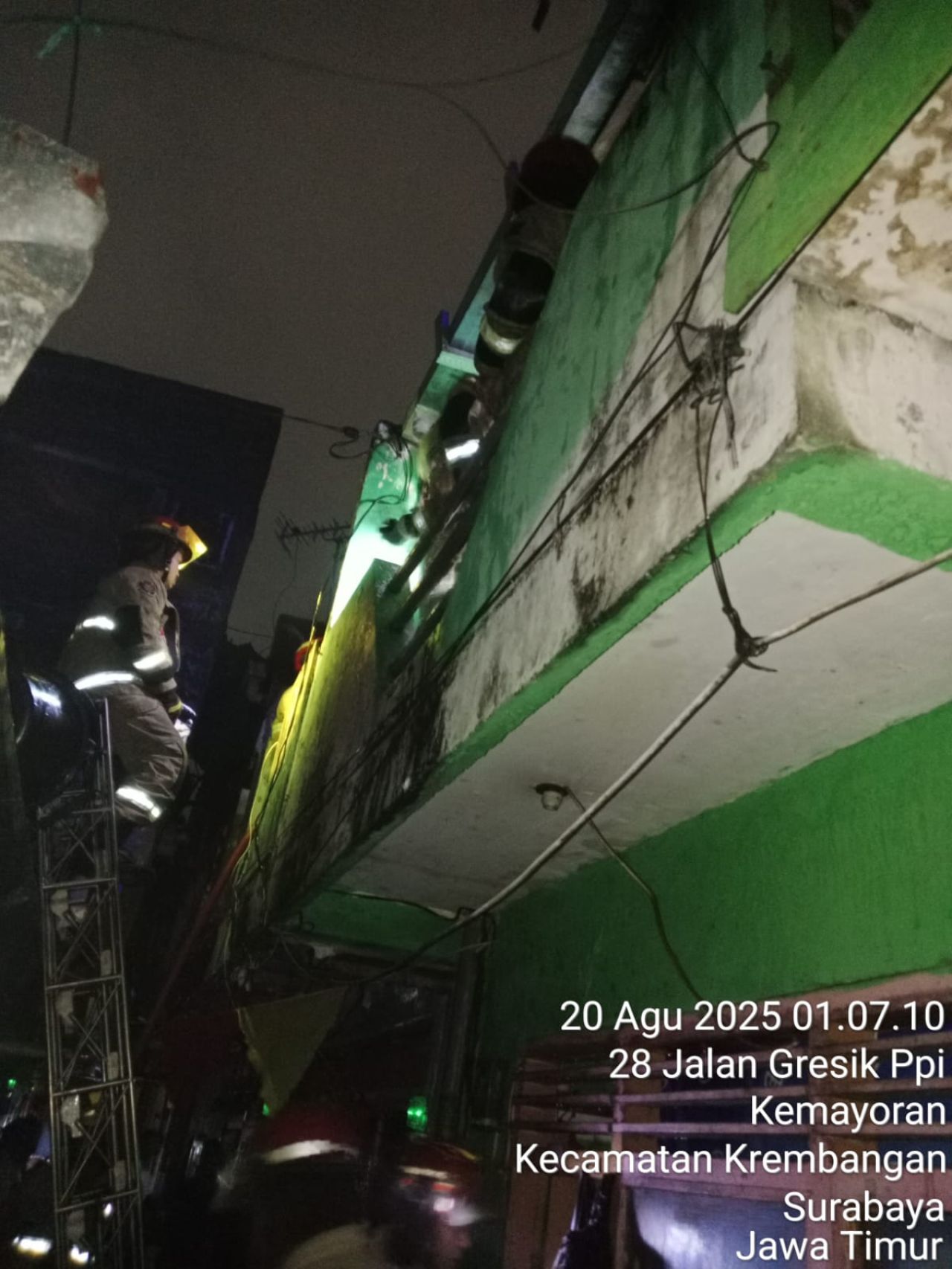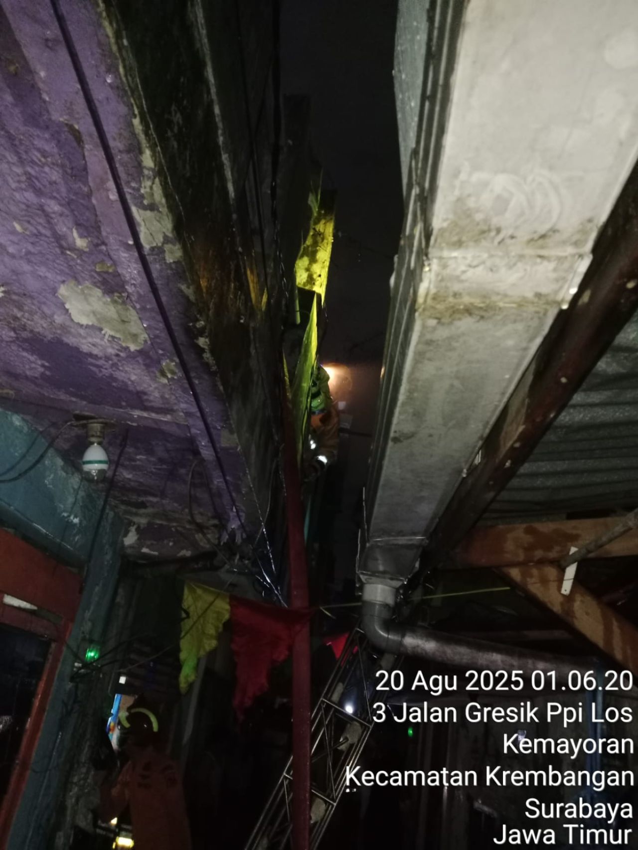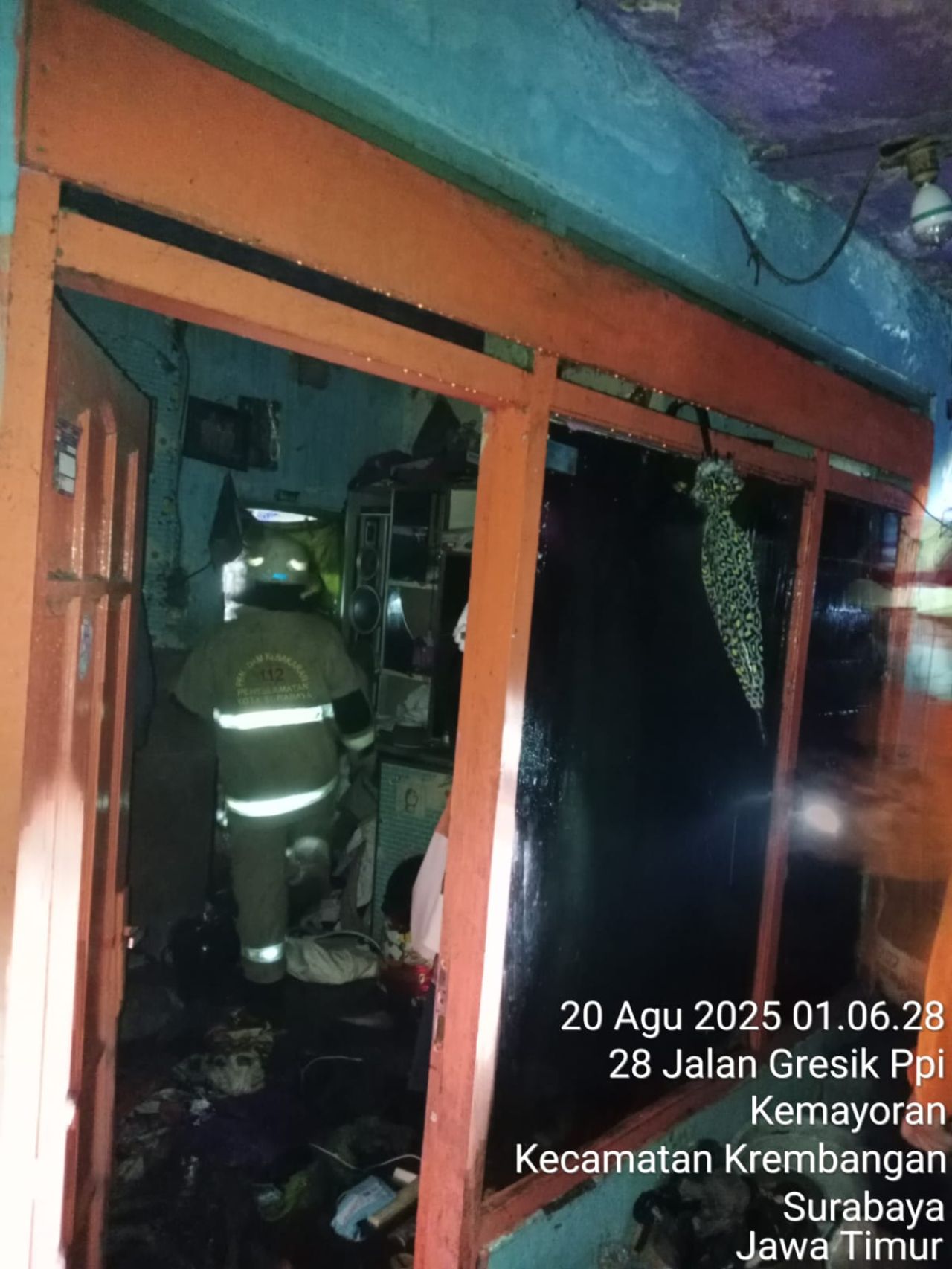 selalu.id – Kebakaran melanda rumah dua lantai di Jalan Gresik PPI Pasar No 50, Kelurahan Kemayoran, Kecamatan Krembangan, Surabaya, Rabu (20/8/2025) dini hari.