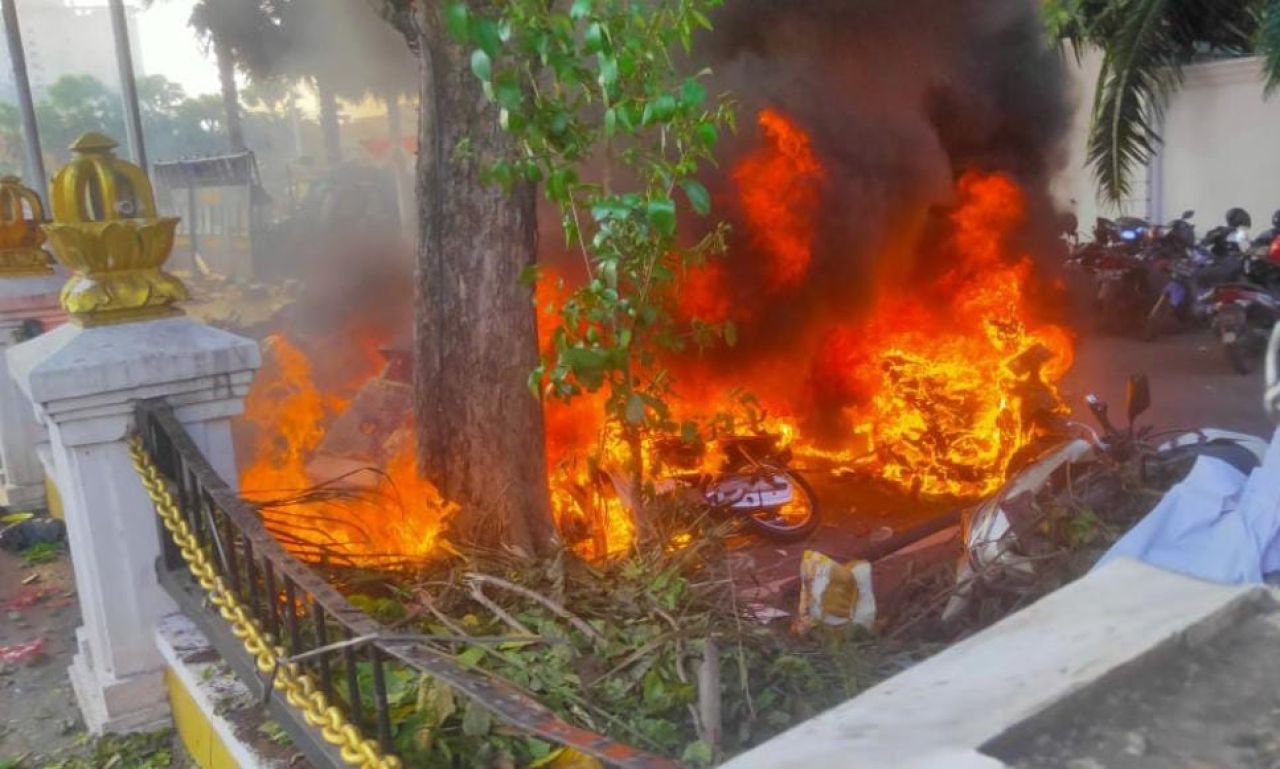 Pantauan selalu.id pukul 17.11 WIB, kerusakan terlihat jelas di area Grahadi. Pagar depan jebol, tenda acara rusak, sementara serpihan kayu dan puing berserakan di halaman. Beberapa sepeda motor hangus terbakar, menyisakan rangka besi yang masih mengeluarkan asap.