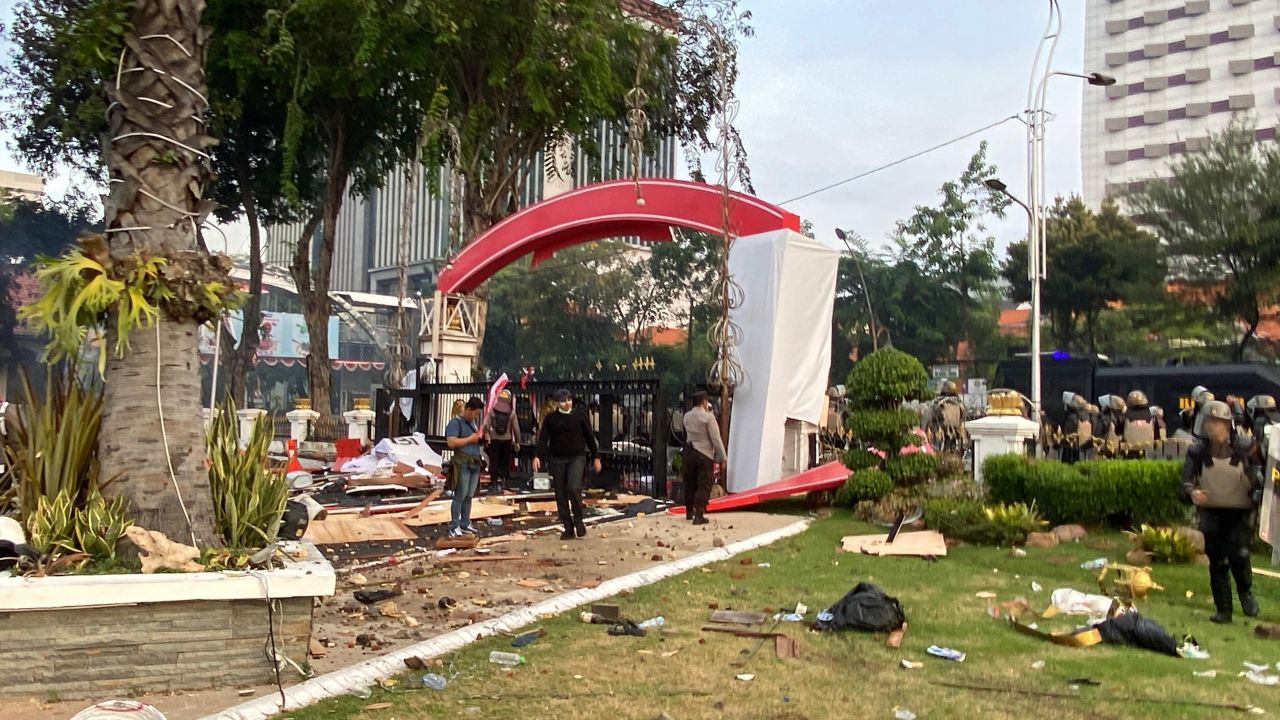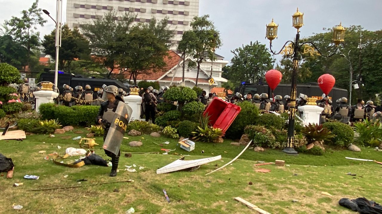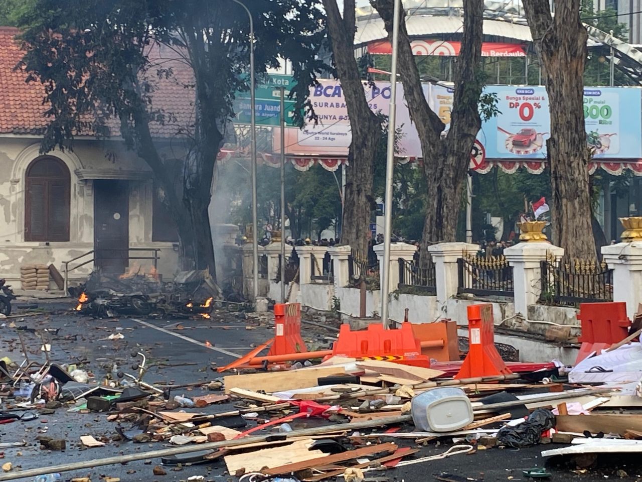 Taman Grahadi yang biasanya asri pun porak-poranda. Sampah, pecahan botol, dan sisa alat peraga aksi berserakan di setiap sudut. Aparat kepolisian tampak siaga di balik pagar, dengan kendaraan taktis dan water cannon terparkir rapat.