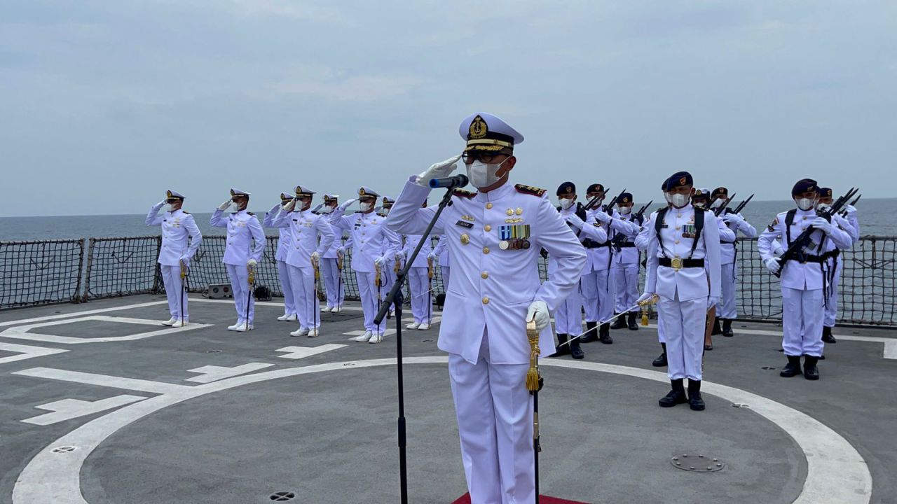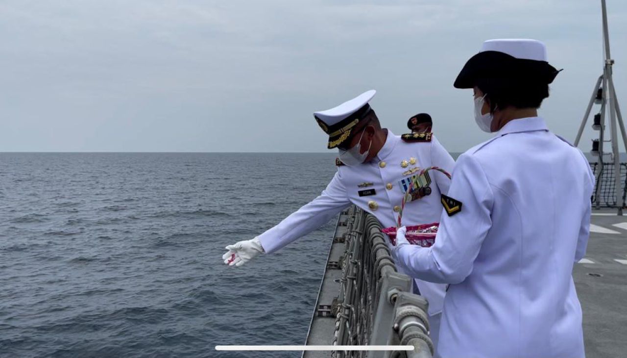 Bertempat di geladak helly tepat di perairan Utara Laut Bali, Komandan KRI Diponegoro-365 Letkol Laut (P) Adam Tjahya memimpin upacara tabur bunga yang diikuti seluruh prajurit kapal perang dari unsur Satuan Kapal Eskorta Koarmada II tersebut, pada Sabtu (12/2/2022).
