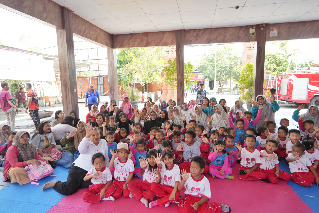 Puluhan siswa taman kanak-kanak tampak antusias mengikuti praktik penanganan api, termasuk cara menggunakan alat pemadam api ringan (APAR) dengan pendampingan petugas dan orang tua.