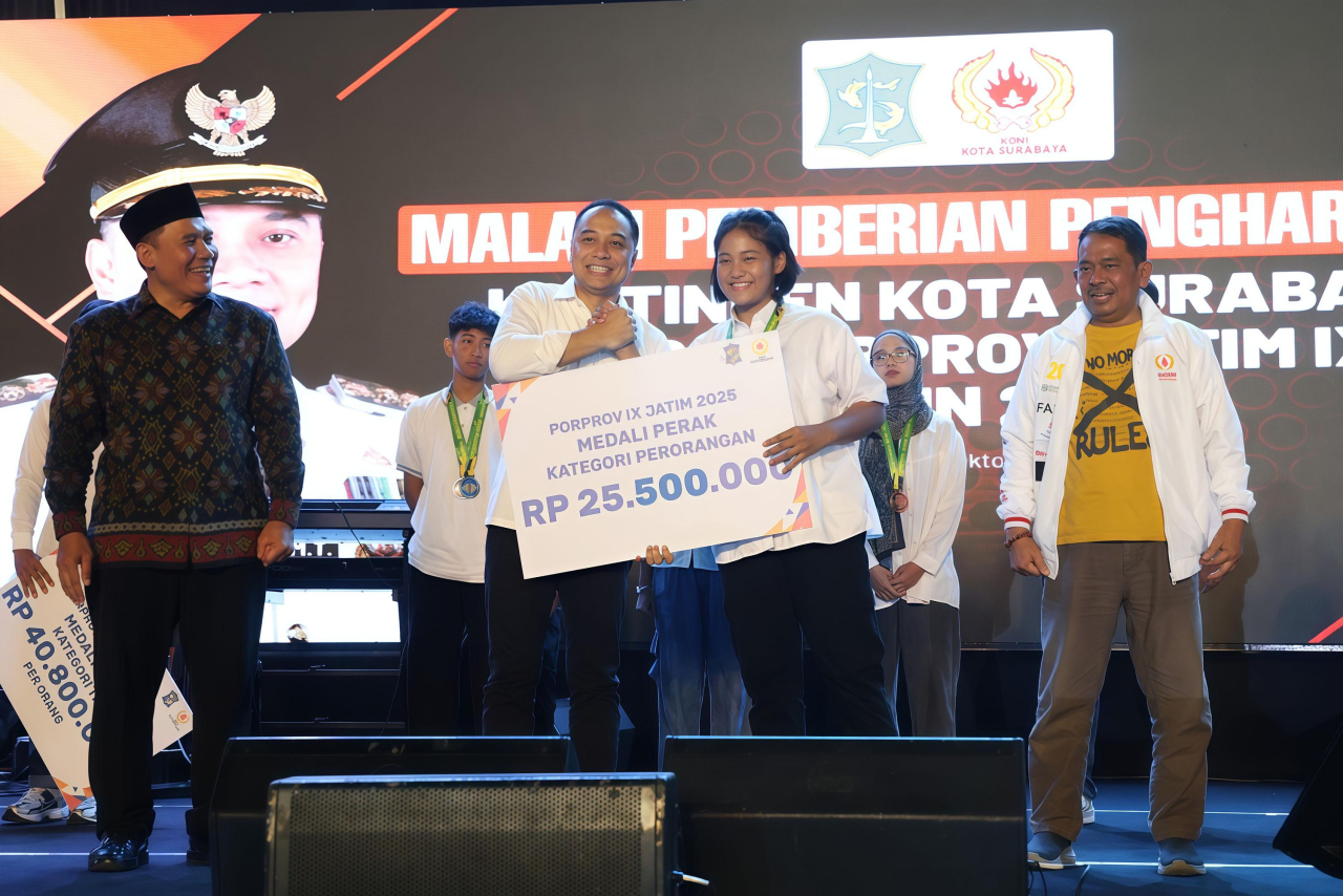 Dalam kesempatan tersebut, Eri menyerahkan bonus senilai total Rp42,7 miliar kepada atlet dan pelatih peraih medali Porprov Jatim 2025. Ia memastikan seluruh penerima telah melalui proses verifikasi berlapis antara KONI Surabaya dan KONI Jawa Timur agar penyaluran berjalan adil dan tepat sasaran.