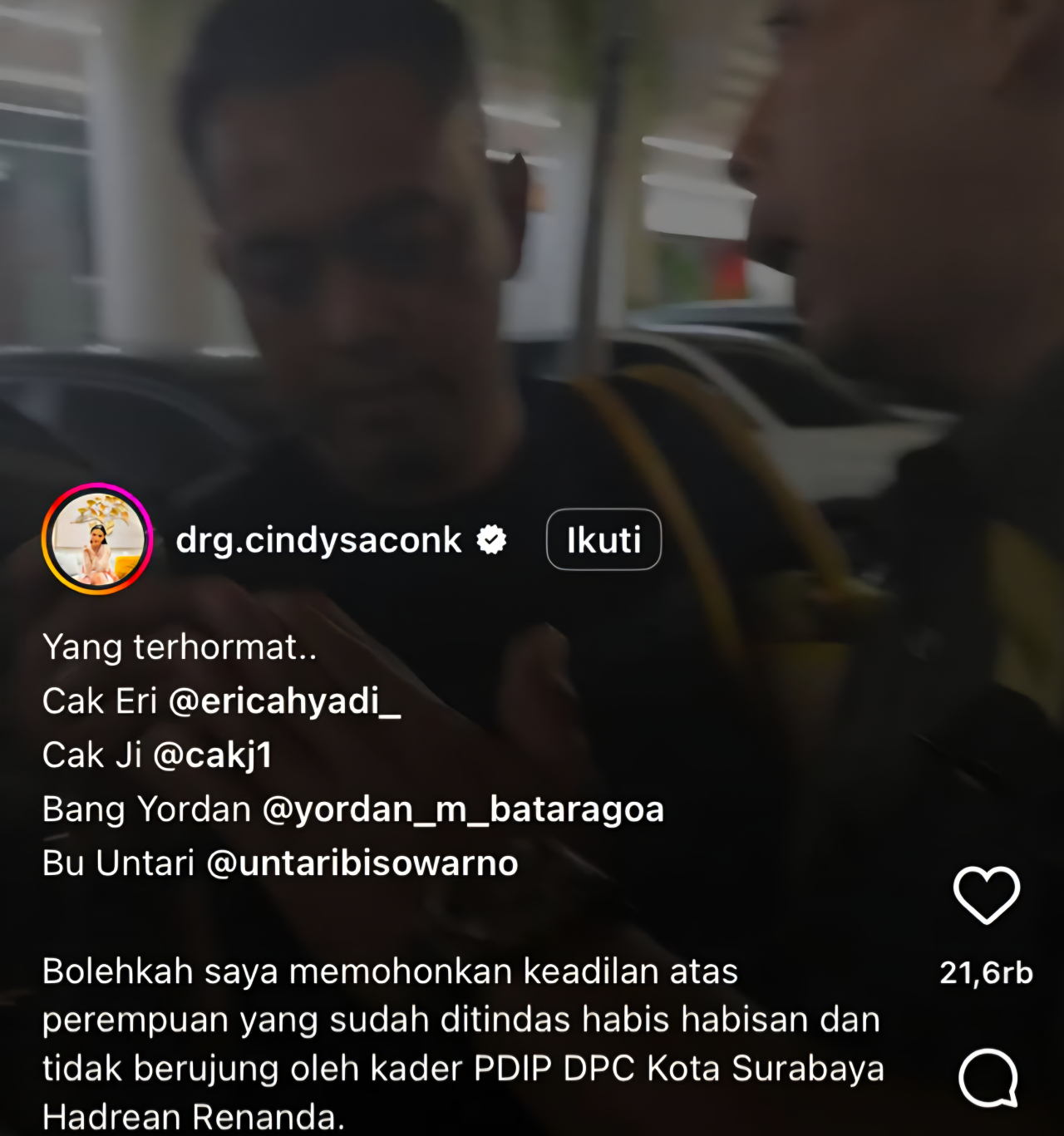 Sebelumnya, Cindy mengungkap persoalan tersebut melalui video di akun Instagram pribadinya, @drg.cindysaconk, yang kemudian viral. Dalam unggahan itu, ia meminta perhatian dari Wali Kota Surabaya Eri Cahyadi dan DPC PDIP Surabaya.