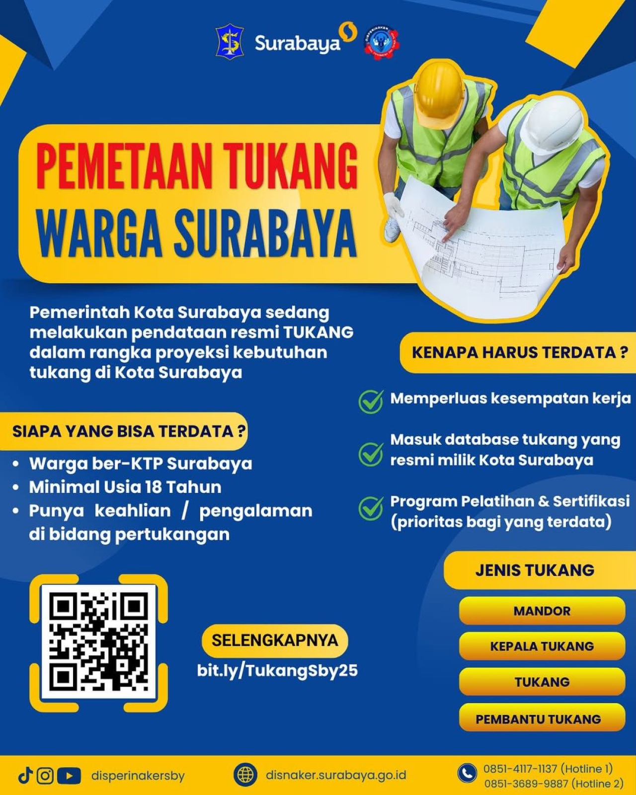 Pendaftaran dilakukan melalui link resmi Disperinaker Surabaya di bit.ly/TukangSby25. Informasi lengkap tersedia di media sosial Disperinaker.