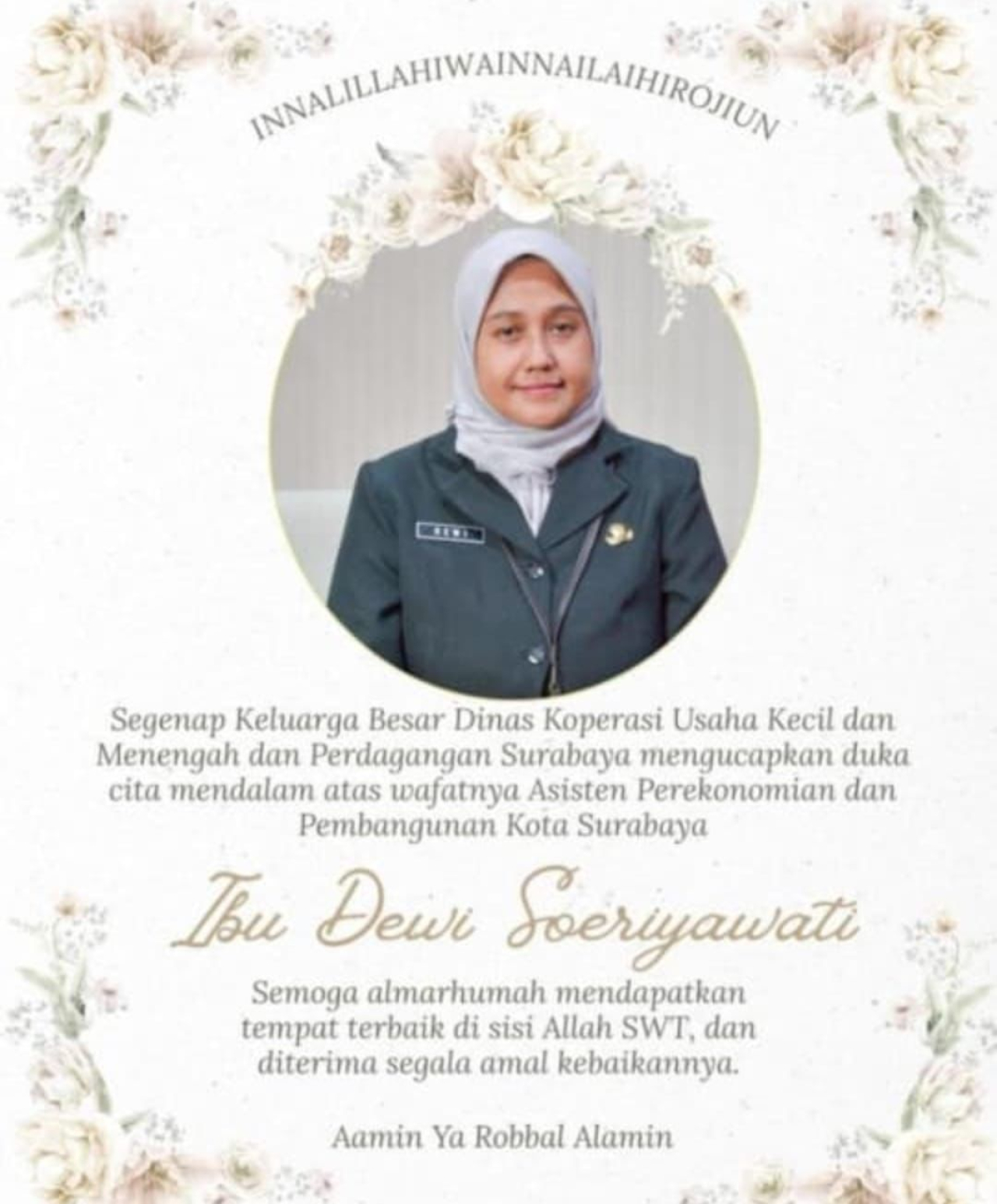 selalu.id - Pemerintah Kota Surabaya berduka atas wafatnya Asisten II Bidang Perekonomian dan Pembangunan. Dewi Soeriyawati. pada Rabu 3 Desember 2025 sore.