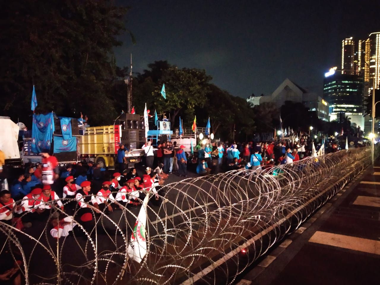 Para buruh menduduki Jalan Gubernur Suryo yang membuat akses kendaraan tutup total.