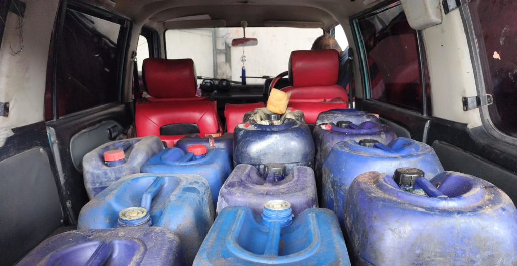 Selanjutnya, petugas menemukan sebuah gudang yang menyimpan 10 jerigen kosong dan 25 jerigen terisi solar subsidi dengan kapasitas masing-masing 25 hingga 30 liter.