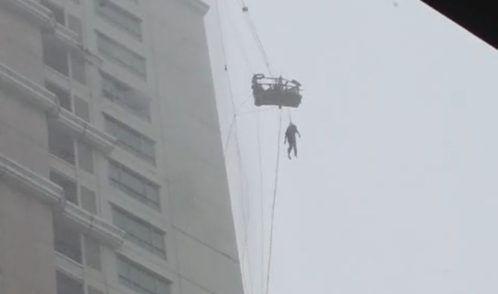 Seorang petugas tampak bergantungan sambil berpegangan pada tali pengaman di ketinggian. Bahkan, petugas itu terombang ambing.