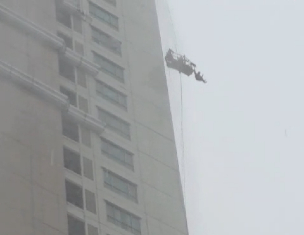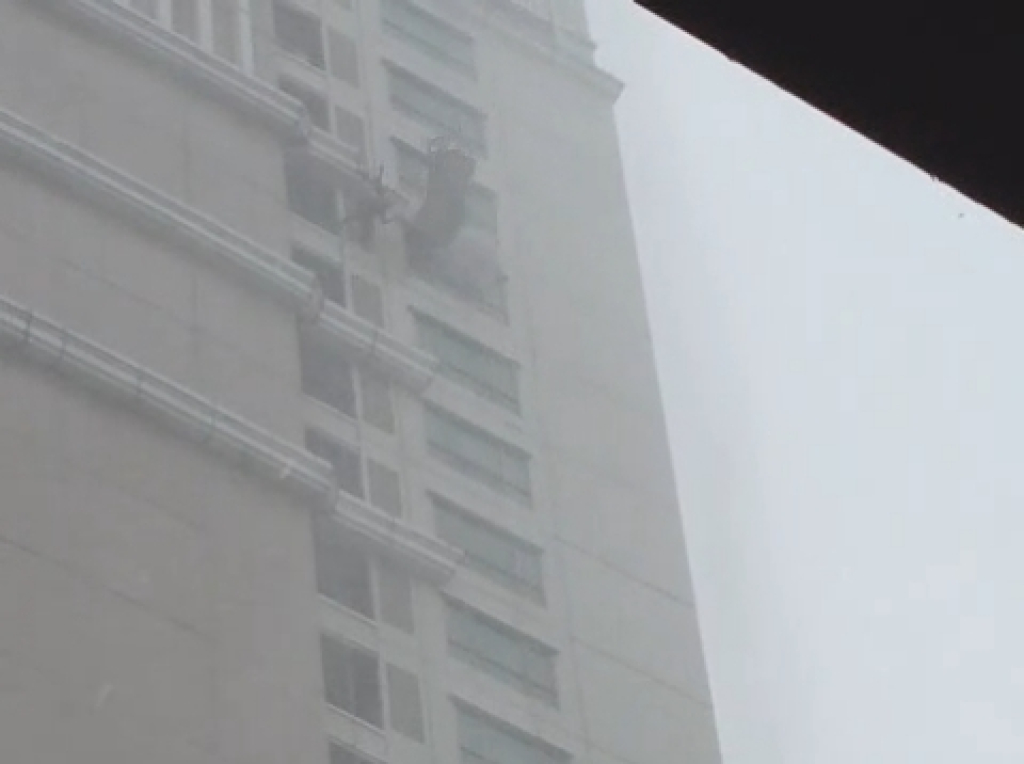 Terlihat pekerja itu hanya bisa pasrah saat gondola yang membawa di ketinggian disapu angin kencang.