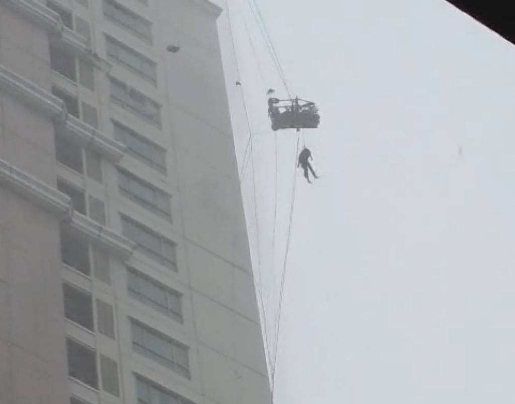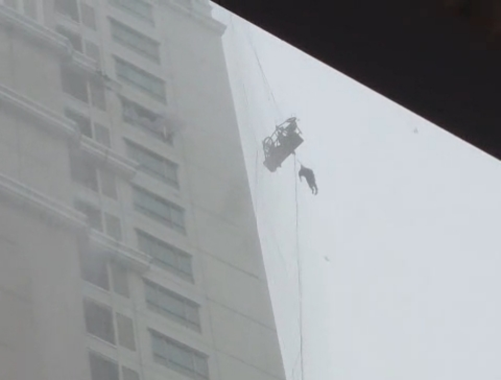 Pekerja itu hanya terus berpegangan pada tali yang terikat di tubuhnya dan gondola.
