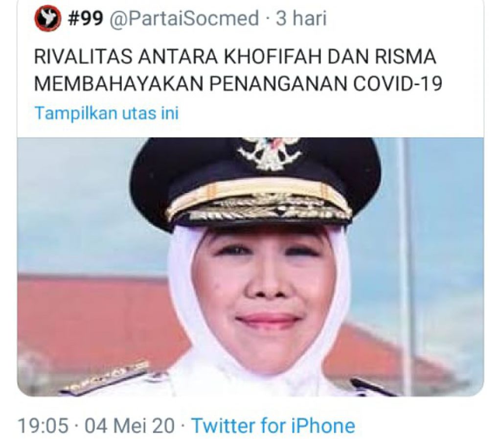 Akun media sosial Twitter @PartaiSocmed secara khusus membahas dengan judul "Rivalitas Antara Khofifah dan Risma Membahayakan Penanganan Covid-19". Dengan memajang foto Khofifah, unggahan 1 Mei 2020 tersebut mendapat respons ribuan orang.