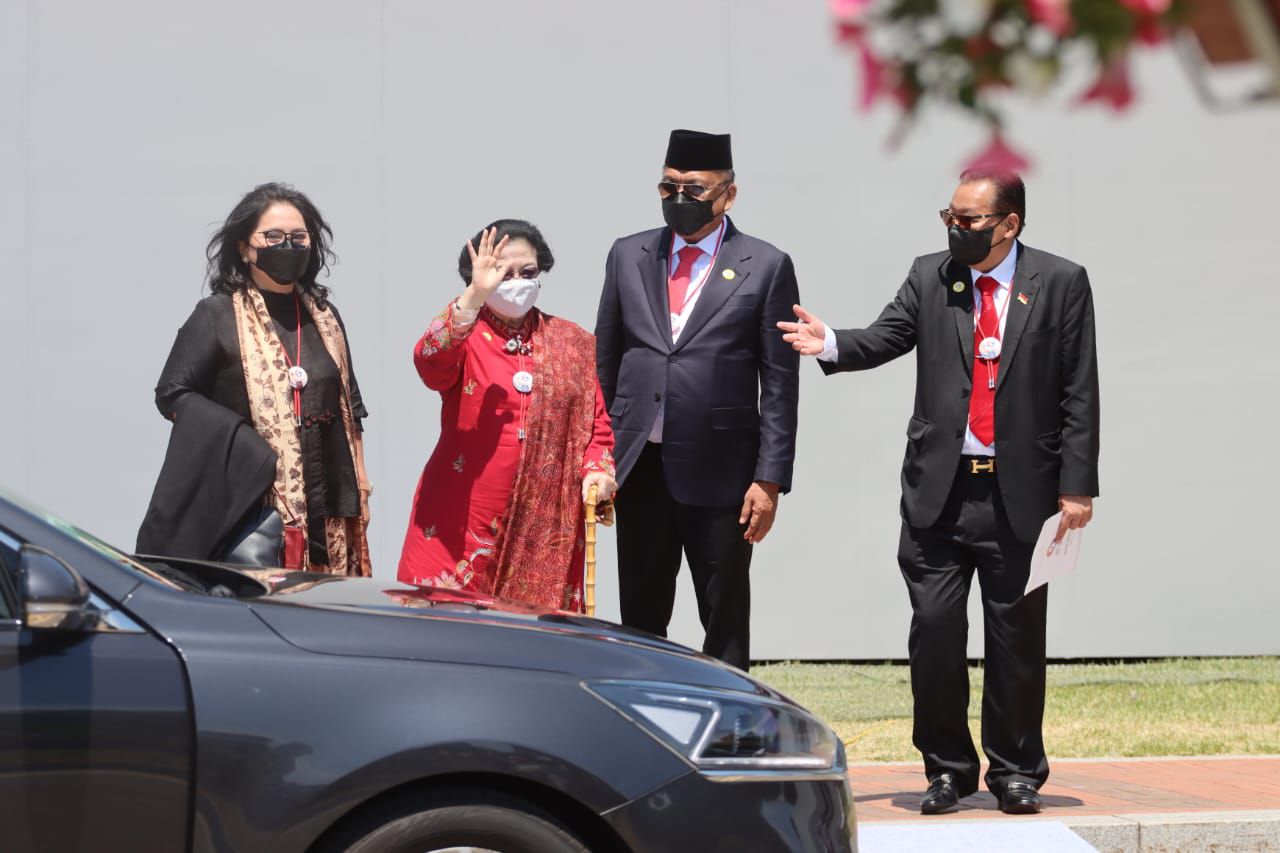 Tampak Megawati hadir dengan didampingi Bendahara DPP PDIP Olly Dondokambey bersama istri Rita Dondokambey. Lalu ada juga Duta Besar RI untuk Korsel Gandi Sulistyanto. Megawati memakai baju kebaya berwarna merah.