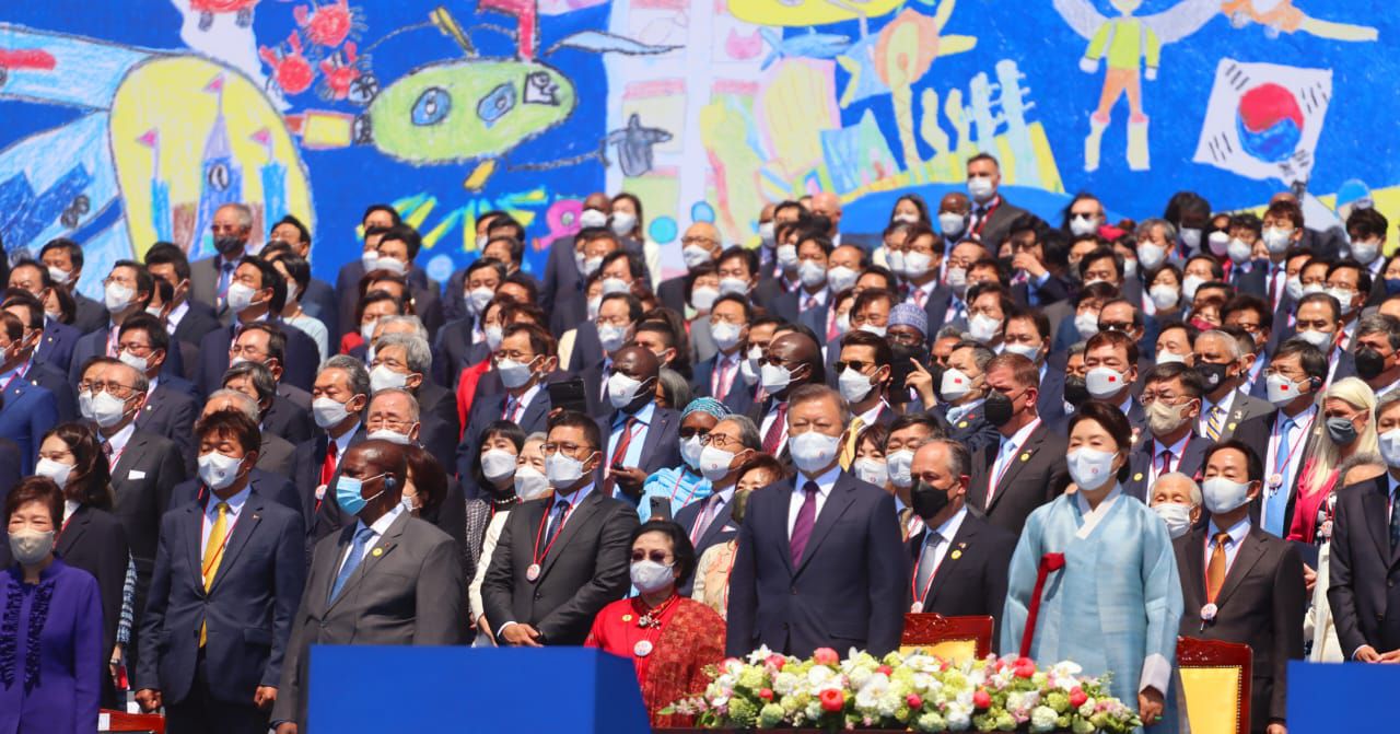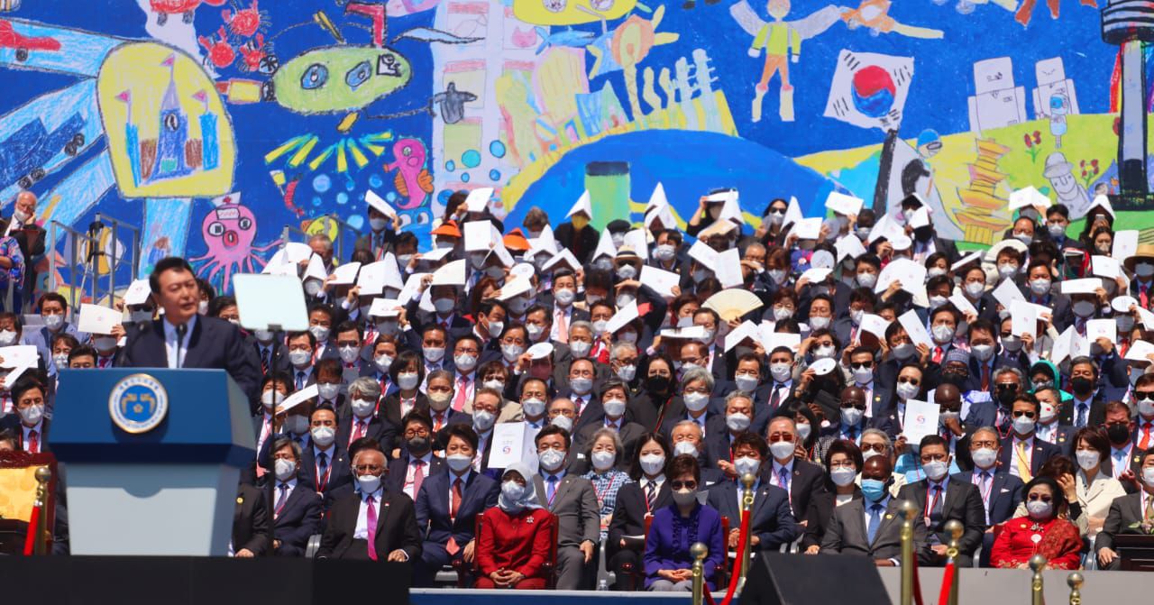 "….yang datang dari luar negeri untuk merayakan kesempatan ini dan tamu-tamu terhormat lainnya atas kehadiran mereka," kata Presiden Yoon.