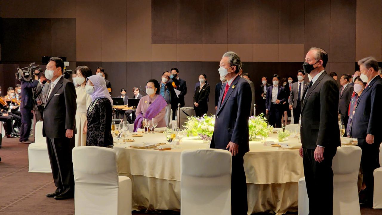 Usai pidato, Presiden Yoon mengajak semua tamu untuk bersulang minuman. Presiden Yoon mendatangi tamu VVIP satu persatu untuk bersulang termasuk dengan Megawati. Memegang gelas berisi jus jeruk peras, Megawati menerima tanda bersulang dari Presiden Yoon.