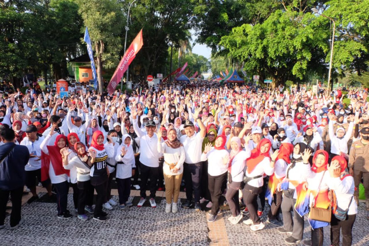 Warga terlihat larut dalam kegembiraan dengan senam dan joget bersama Bupati Ngawi, Ony Anwar Harsono.