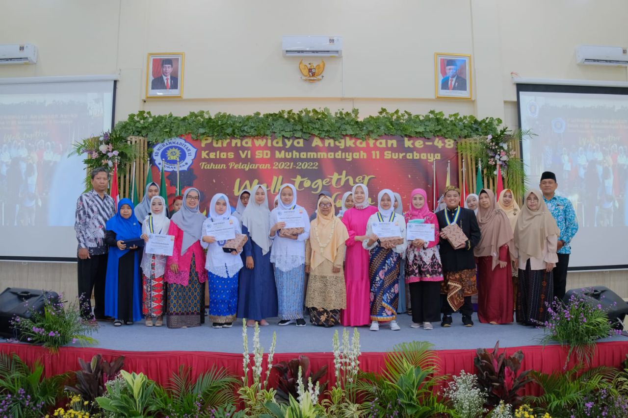Momen purna widya kali ini digelar di aula AR Fachruddin gedung SD Muhammadiyah 11 Surabaya, Sabtu (11/6/2022).