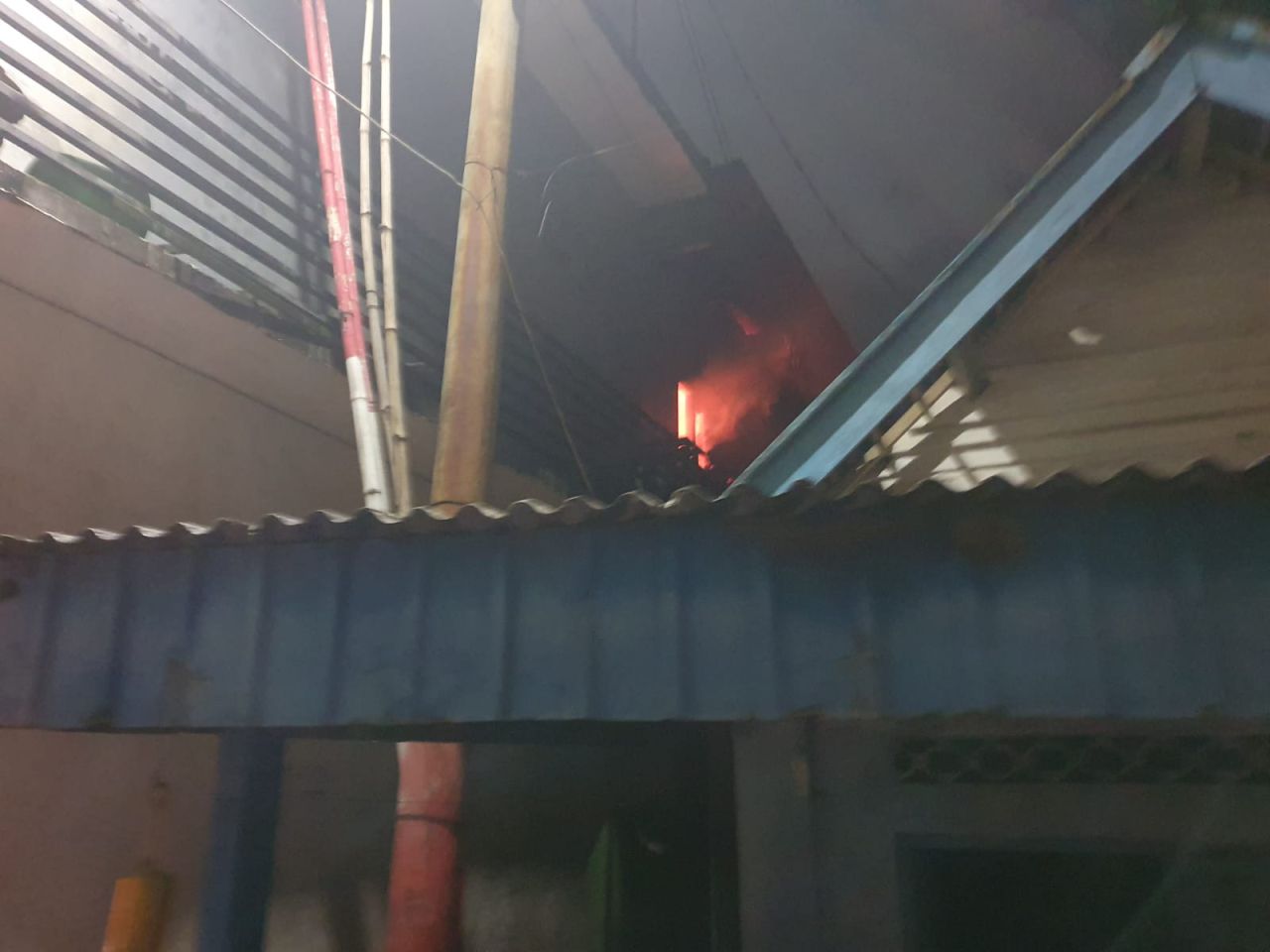 Kebakaran ini terjadi di pemukiman padat penduduk dengan gang sempit yang mempersulit akses masuk mobil pemadam kebakaran.