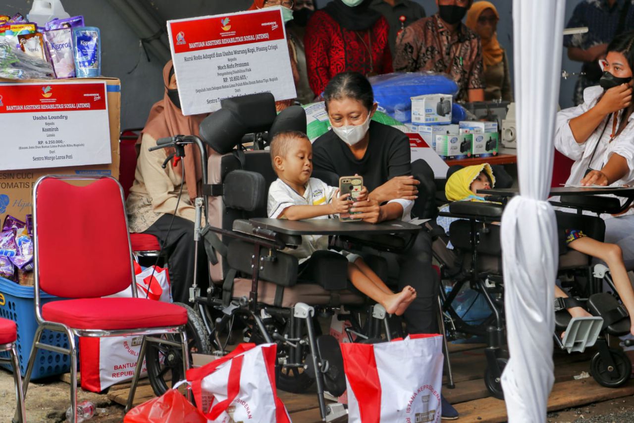 Rafa (5) salah satu penyandang disabilitas mendapat bantuan kursi roda adaptif melalui Kementerian Sosial yang diserahkan langsung oleh Presiden Jokowi.