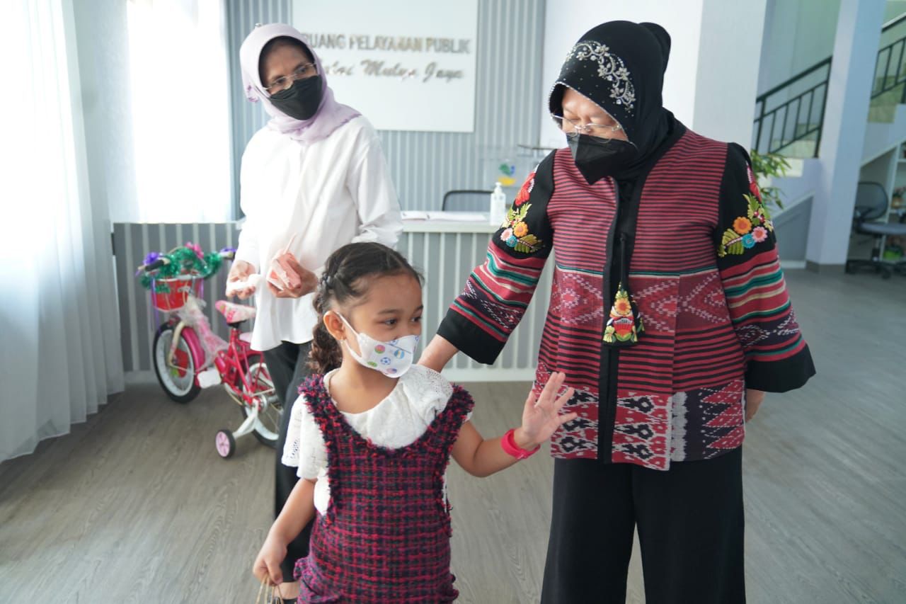 selalu.id - Cucu Menteri Sosial, Tri Rismaharini, Gwen Syareefa Benardi menyambangi gadis 7 tahun asal Aceh Annisa Tulzhanah penderita kelainan jantung dan tengah dirawat Sentra Mulya Jaya, Jakarta.