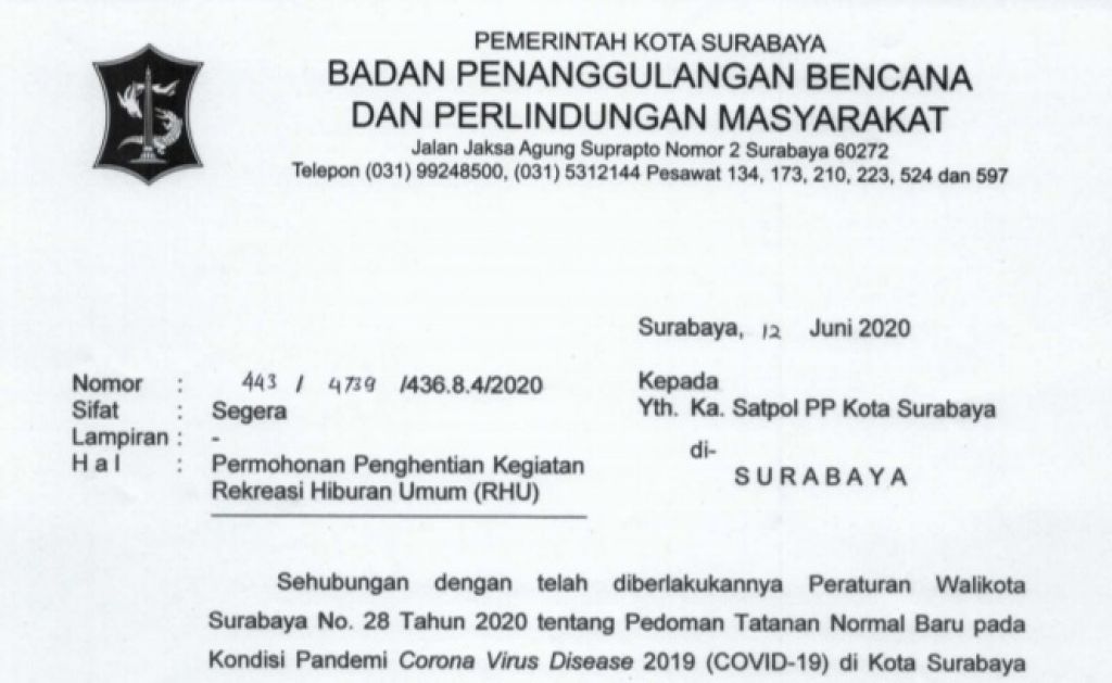 Wakil Sekretaris Gugus Tugas Percepatan Penanganan Covid-19 Kota Surabaya yang juga Kepala BPB dan Linmas Surabaya, Irvan Widyanto mengatakan hari ini, Jumat (12/6/2020), pihaknya sudah mengirimkan surat kepada Kepala Dinas Kebudayaan dan Pariwisata tentang permohonan penutupan tempat RHU. Selain itu, ia juga mengaku sudah mengirimkan surat kepada Kasatpol PP Surabaya tentang permohonan penghentian kegiatan RHU.