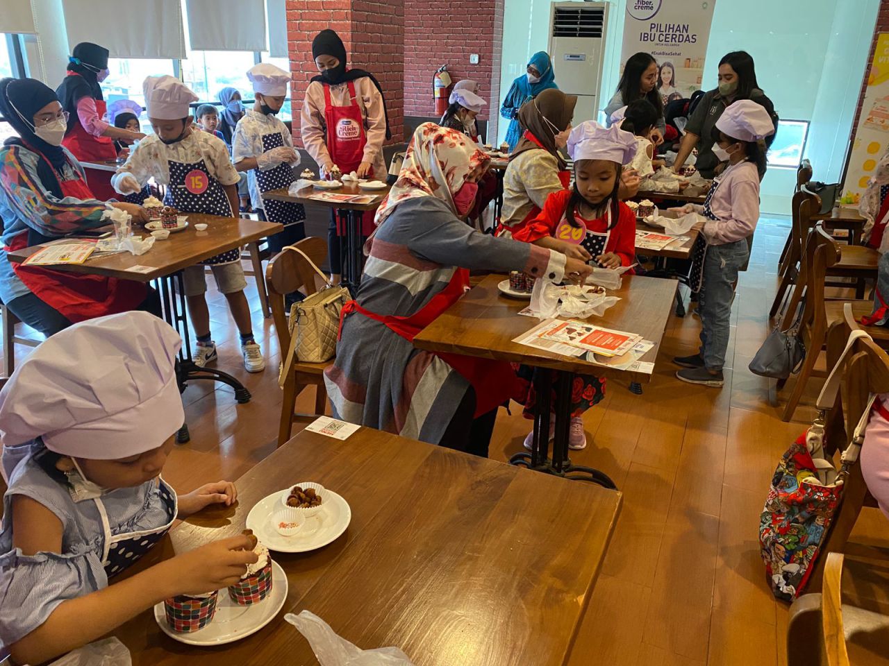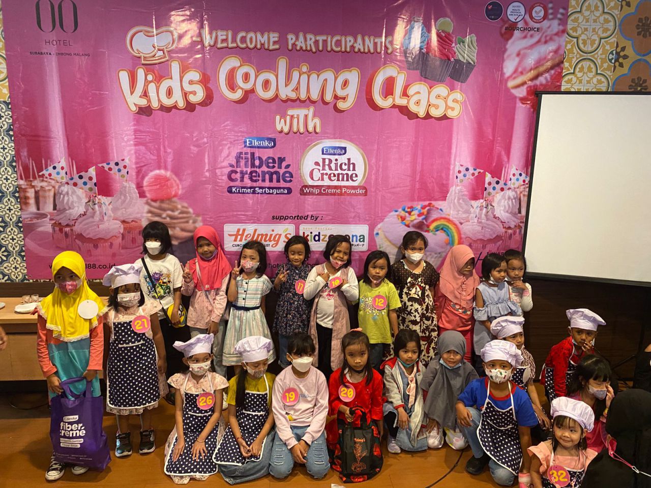 Dengan kostum koki cilik yang lucu, para peserta mendengarkan arahan menghias Cup Cake dari executive chef Hotel 88 Embong Malang.
