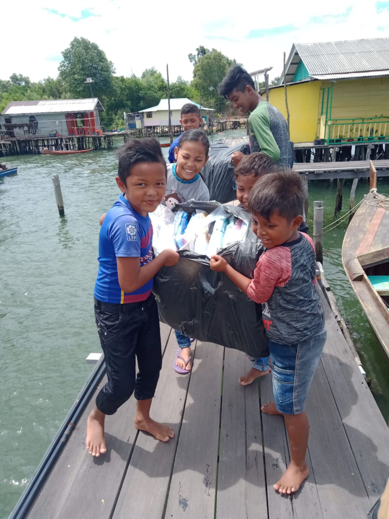 Menyambut kedatangan bantuan, beberapa anak-anak bergotong royong mengangkat karung yang berisi seragam baru dari rumah panggung tepi anjungan pulau Bertam ke Gedung sekolah di darat.