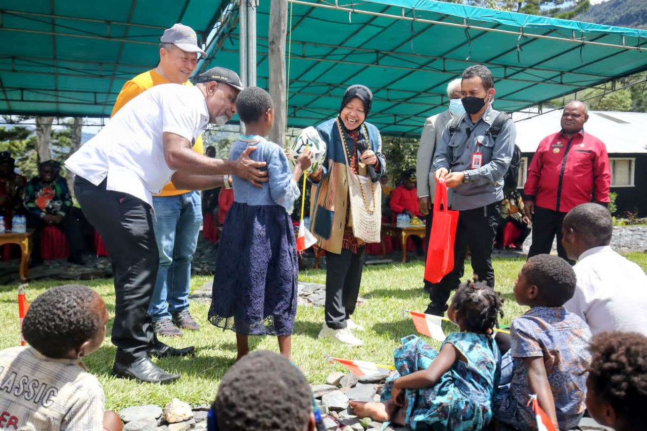 Dalam momen berharga itu, Mensos Risma menyerahkan secara simbolis bantuan sosial senilai Rp. 503.209.620,- kepada Bapak Komarudin Watubun dan selanjutnya diserahkan kepada Bupati Puncak Jaya, Yuni Wonda. Bantuan tersebut berupa makanan ringan dan susu sebanyak 1.000 paket, pakaian dewasa berupa baju dan celana sebanyak 1.000 pasang, pakaian anak 1.000 potong, bola sepak 20 buah, raket bulutangkis 20 buah, net bulutangkis 10 buah, _shuttlecock_ 10 tabung, ayunan anak 5 unit, dan perosotan anak 5 unit.