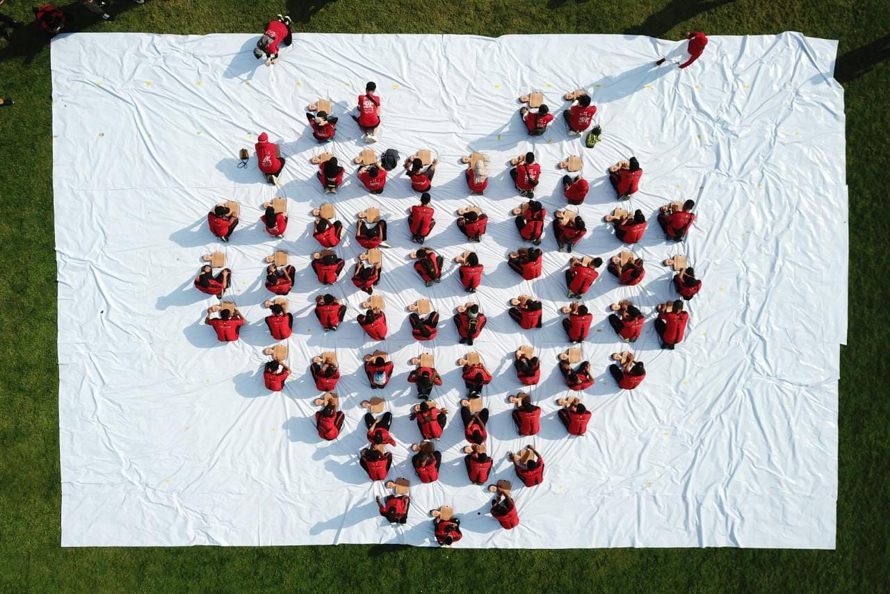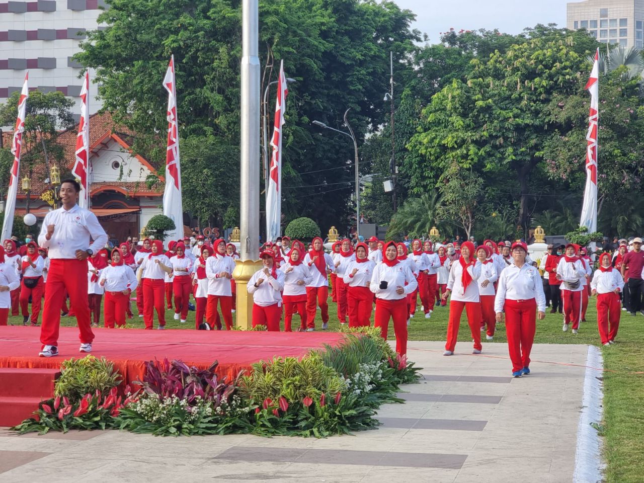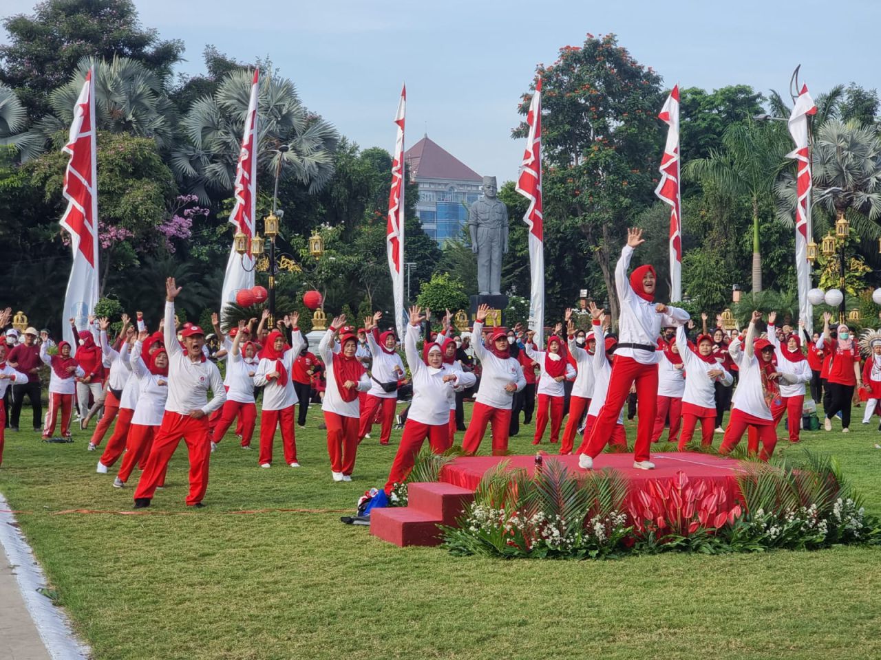 Peserta membentuk formasi hati (heart) dan juga angka 77 sebagai kado spesial bagi Hari Jadi ke-77 Pemerintah Provinsi Jawa Timur. (SL1)