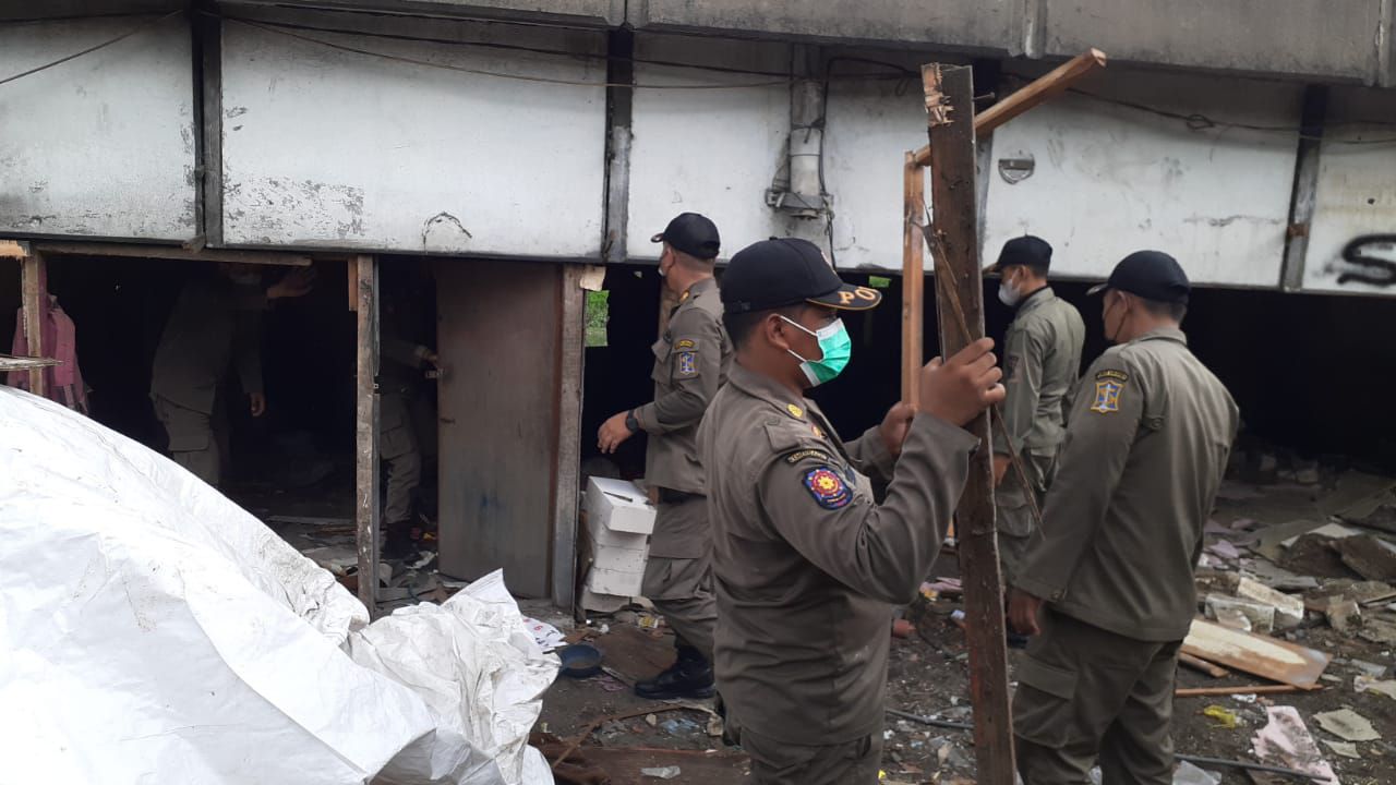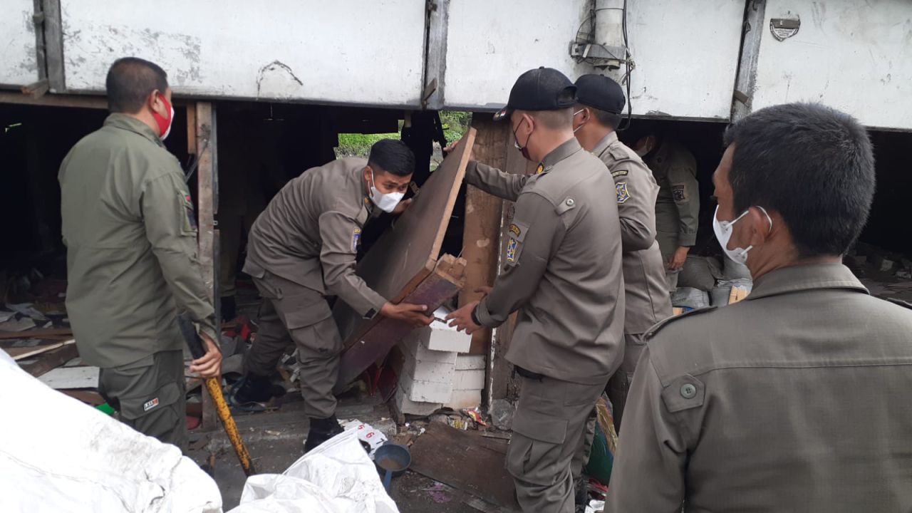 Pantuan selalu.id, terlihat sejumlah petugas Satpol PP Surabaya membongkar bongkahan kayu-kayu tempat tinggal warga di kolong jembatan tersebut.