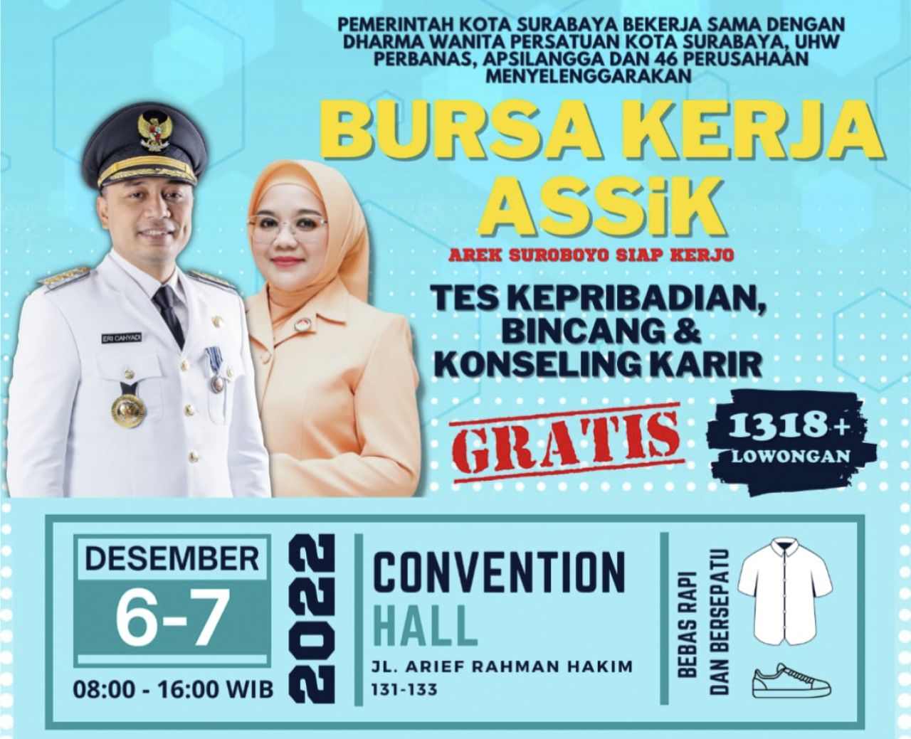 selalu.id - Pemerintah Kota (Pemkot) Surabaya menggelar job fair atau bursa kerja dengan tema 'Arek Suroboyo Siap Kerja' Assik di Convention Hall, Jalan Arif Rahman Hakim, Surabaya, Selasa (6/12/2022). Acara tersebut digelar hingga Rabu 7 Desember 2022 mendatang.