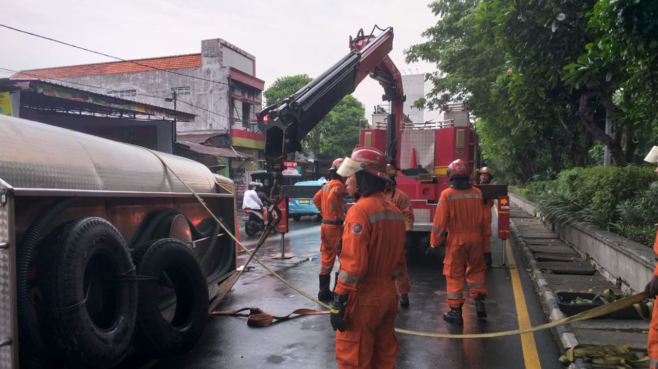 Untuk truk terguling, petugas rescue Damkar dan petugas lainnya melakukan evakuasi truk yang melintang ditengah jalan.