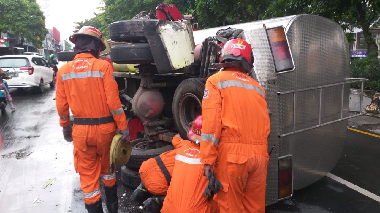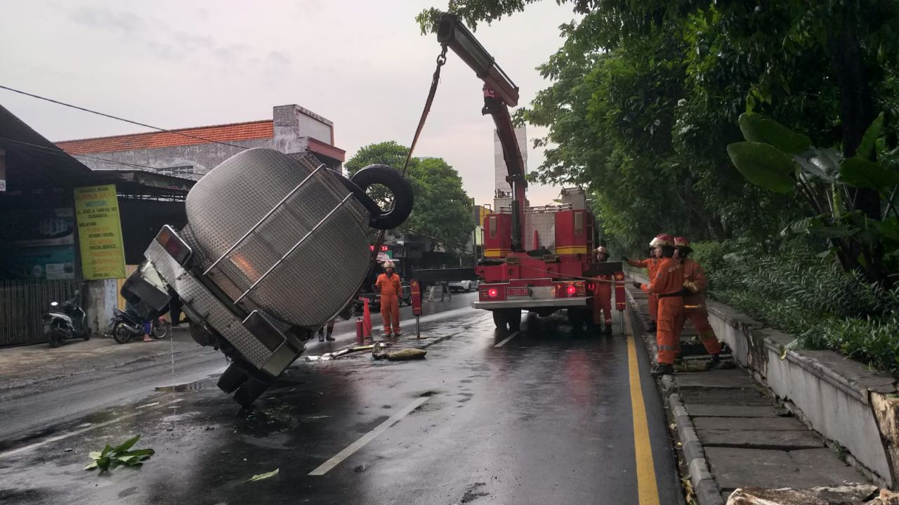 Truk Terguling di Jalan A Yani Surabaya usai Hindari Motor Berhenti Mendadak