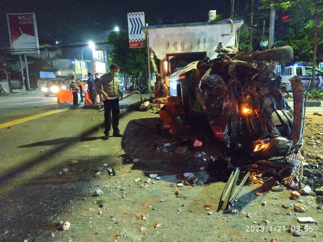 Tampak mobil Pajero berwarna abu-abu tersebut mengalami kerusakan yang cukup parah lantaran terbalik dua kali sesudah menabrak pos polisi. Dua pengemudi dilaporkan mengalami luka-luka.