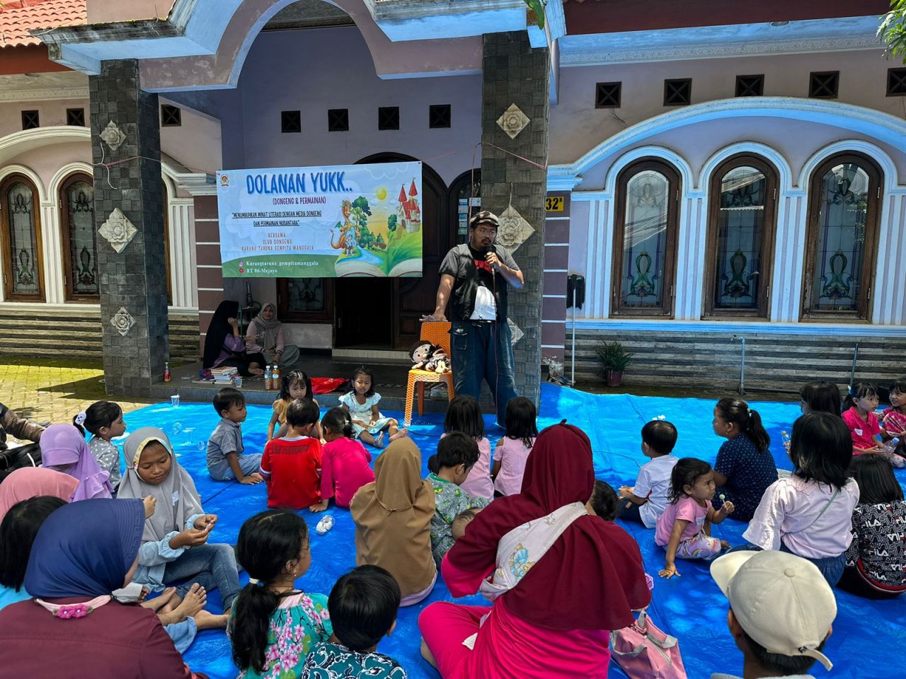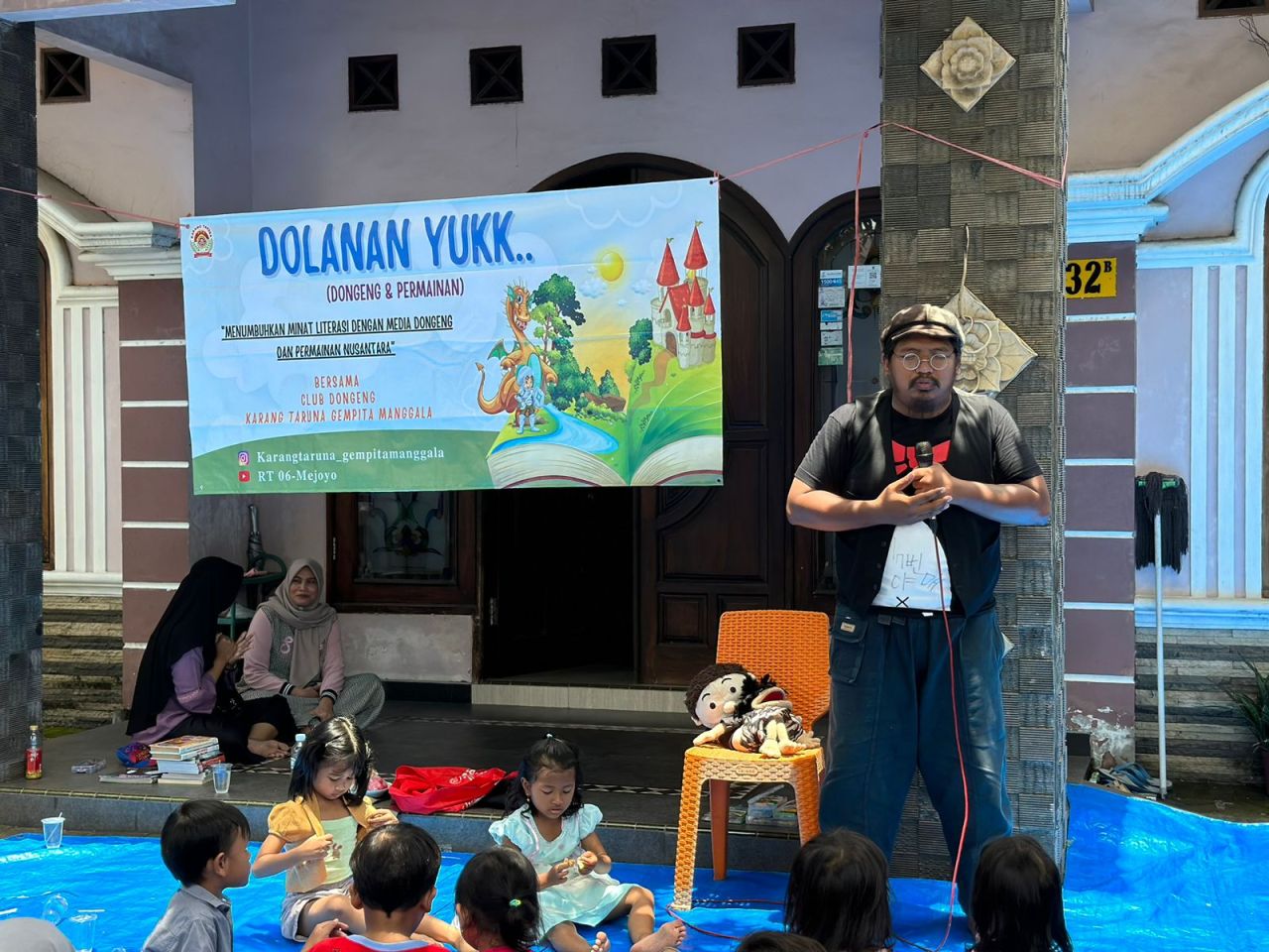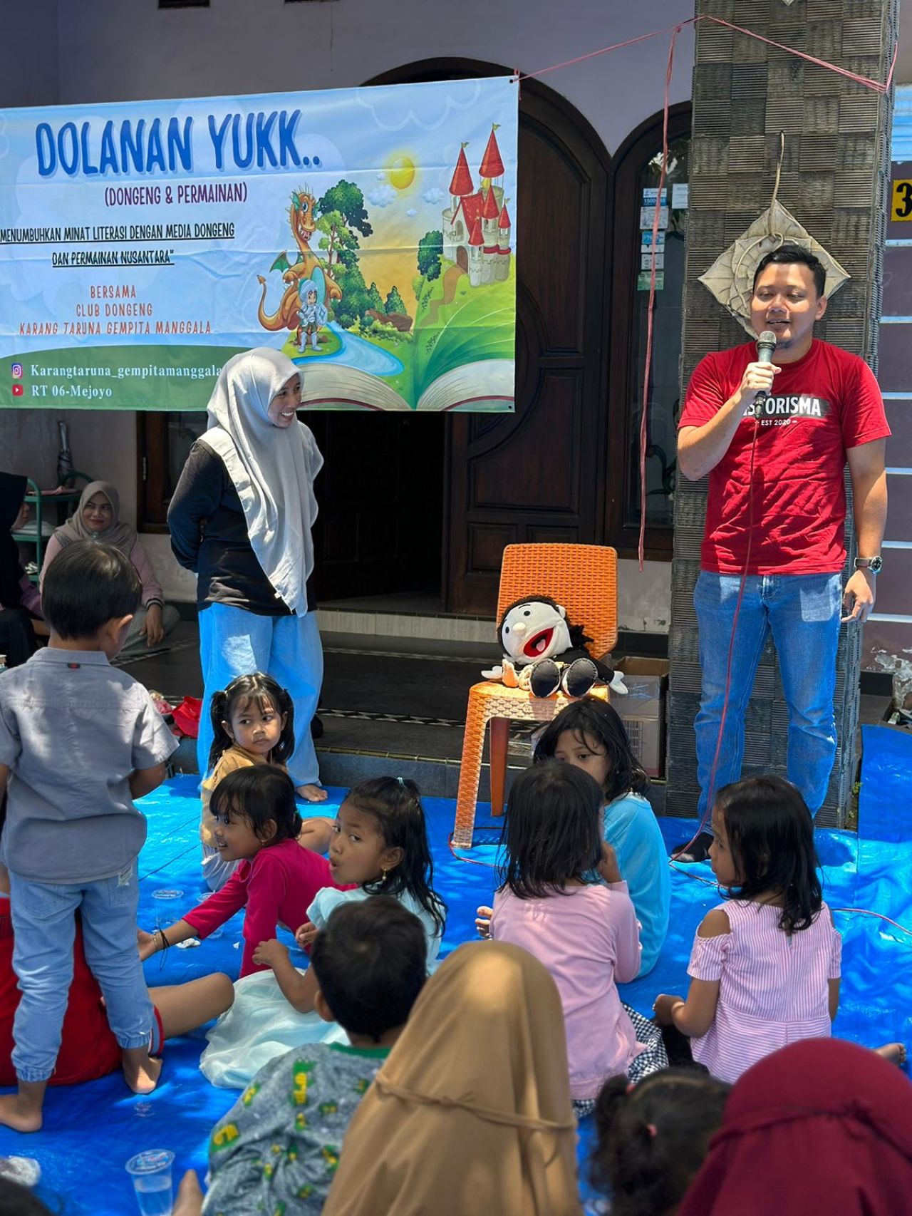 Acara yang digelar oleh Karang Taruna itu diisi kegiatan mendongeng yang dibawakan oleh pegiat literasi anak atau pendongeng Surabaya, Cak Handoko.