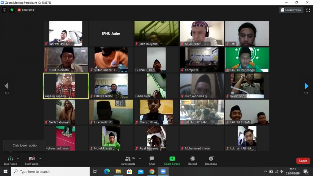 Surabaya (selalu.id) - Lembaga Penanggulangan Bencana dan Perubahan Iklim (LPBI) Pengurus Wilayah Nahdlatul Ulama (PWNU) Jawa Timur menggelar Rapat Koordinasi Relawan NU se Jawa Timur via Daring Jumat, (21/8/2020). Agenda berfokus pada kontribusi relawan NU Jawa Timur dalam membantu penanganan pandemi Covid-19 melalui aplikasi inaRisk.