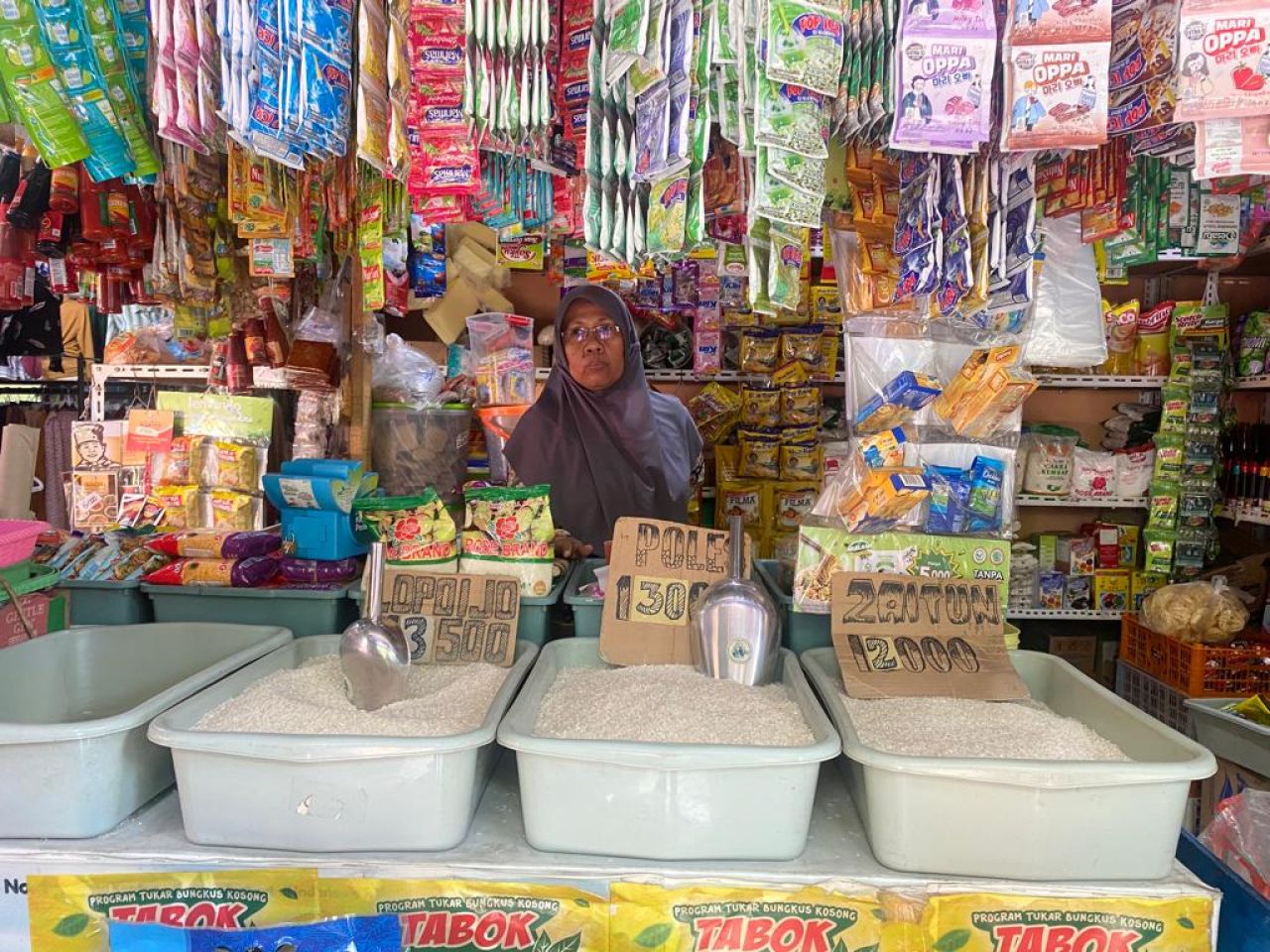 "Semua beras Rp 2000-Rp 3000, beras Bulog lama gak dikirim, sudah sebulan lebih. Per kilo naik ada yang Rp1.000 - Rp1.800. Banyak yang cari beras bulog soalnya murah meriah, Rp63.000 - Rp69.000," tuturnya.