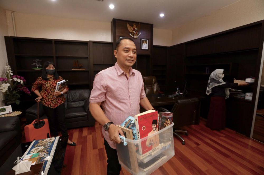Surabaya (selalu.id) - Setelah teken surat pengunduran diri dari Aparatur Sipil Negara (ASN), calon wali kota Surabaya dari PDI Perjuangan Eri Cahyadi mengemasi barang-barang di kantornya, Badan Perencanaan Pembangunan Kota (Bappeko) Surabaya. Dia dilepas para pegawai Bappeko dengan haru.