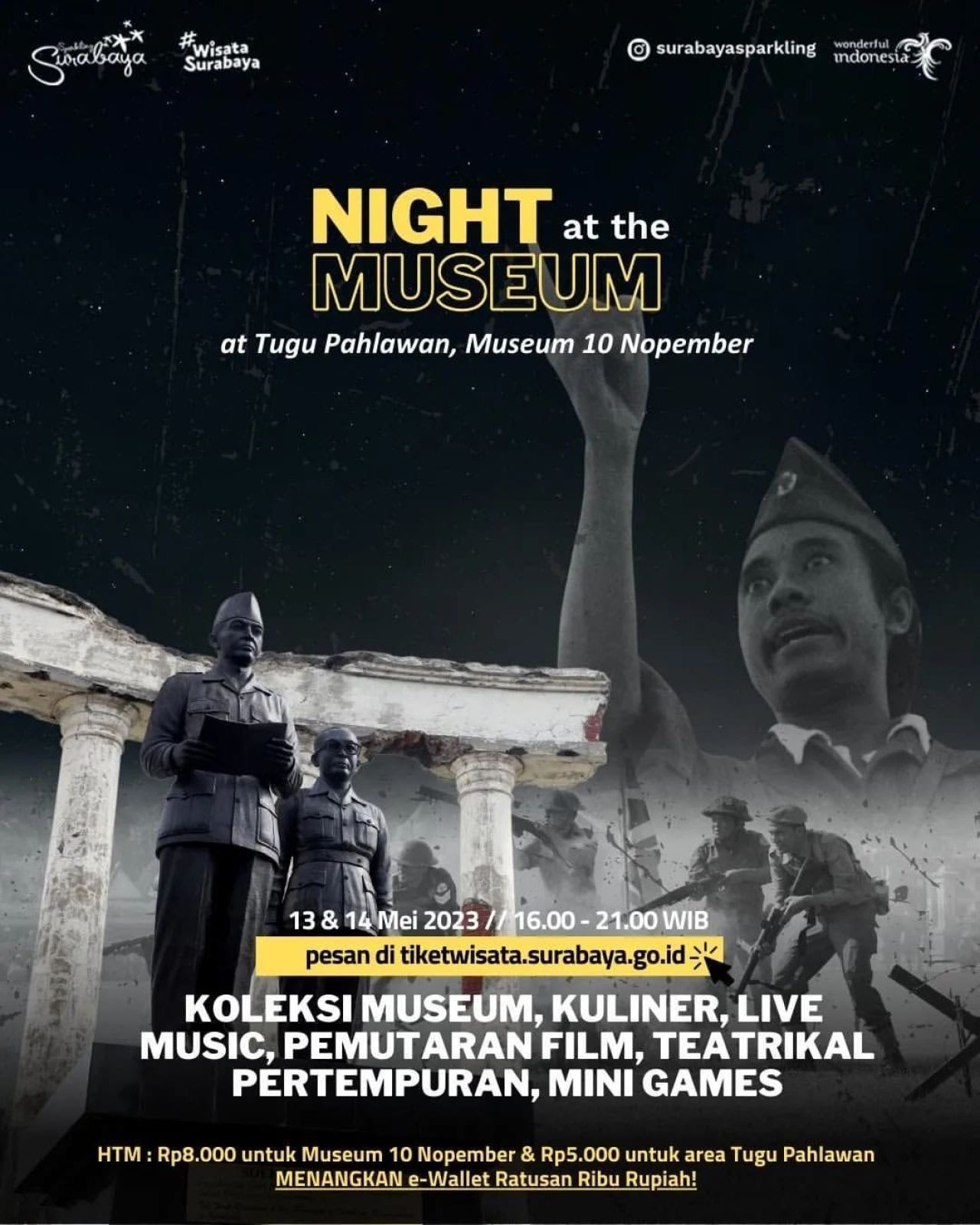 “Untuk acara The Night at The Museum dibuka mulai pukul 16.00-21.00 WIB, dan panitia akan memberikan arahan serta mengingatkan pengunjung. Selain bisa menikmati koleksi museum pada malam hari, para wisatawan juga disuguhkan pertunjukan musik, drama teatrikal pertempuran, serta nonton bareng (nobar) film dokumenter Soera Ing Baja,” kata Saida sapaan lekatnya, Jumat (12/5/2023).