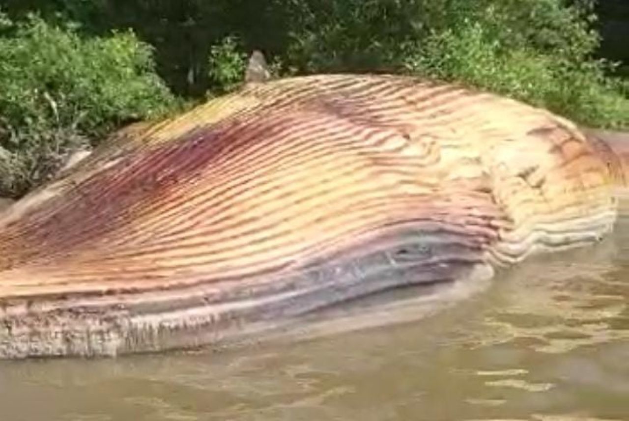 Diberitakan sebelumnya, beredar video Paus terdampar di perairan Surabaya. Tampak Paus tersebut kondisi mati terbalik di bibir pantai.