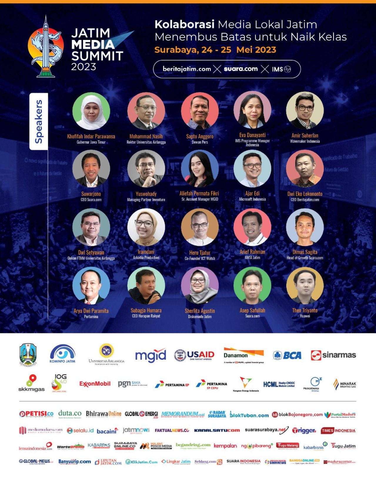 CEO PT Arkadia Digital Media Tbk yang juga Pemimpin Redaksi Suara.com, Suwarjono, direncanakan berbagi pengalaman seputar pendanaan media digital, media lokal dan segmentasi khusus. Sementara itu, CEO Beritajatim.com Dwi Eko Lokononto akan memberikan sambutan, selain Konsul Jenderal Amerika Serikat di Surabaya Jonathan Alan yang juga dikabarkan akan hadir. Akan halnya keynote speech, rencananya akan disampaikan oleh Gubernur Jatim Khofifah Indar Parawansa yang sekaligus dijadwalkan membuka acara.