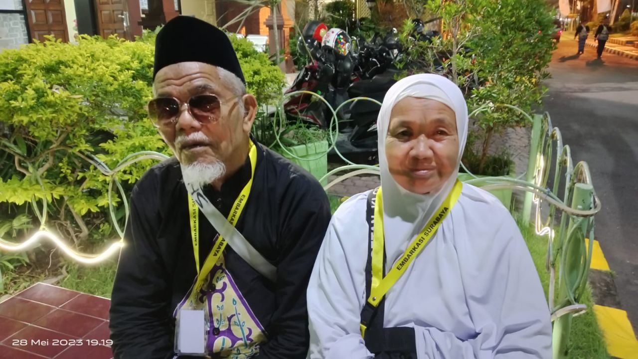 Sempat tertunda dua tahun karena pandemi Covid-19, Mbah Soleh bersama istri tercintanya berangkat tahun ini.