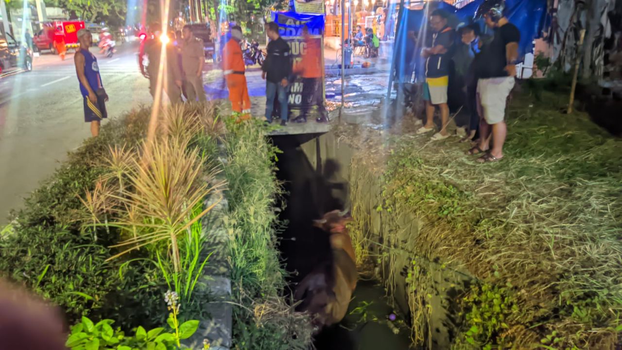 selalu.id - Seekor sapi kurban tercebur ke dalam selokan yang berada di Jalan Ketintang Madya No 88, Gayungan, Surabaya, Rabu (28/6/2023).