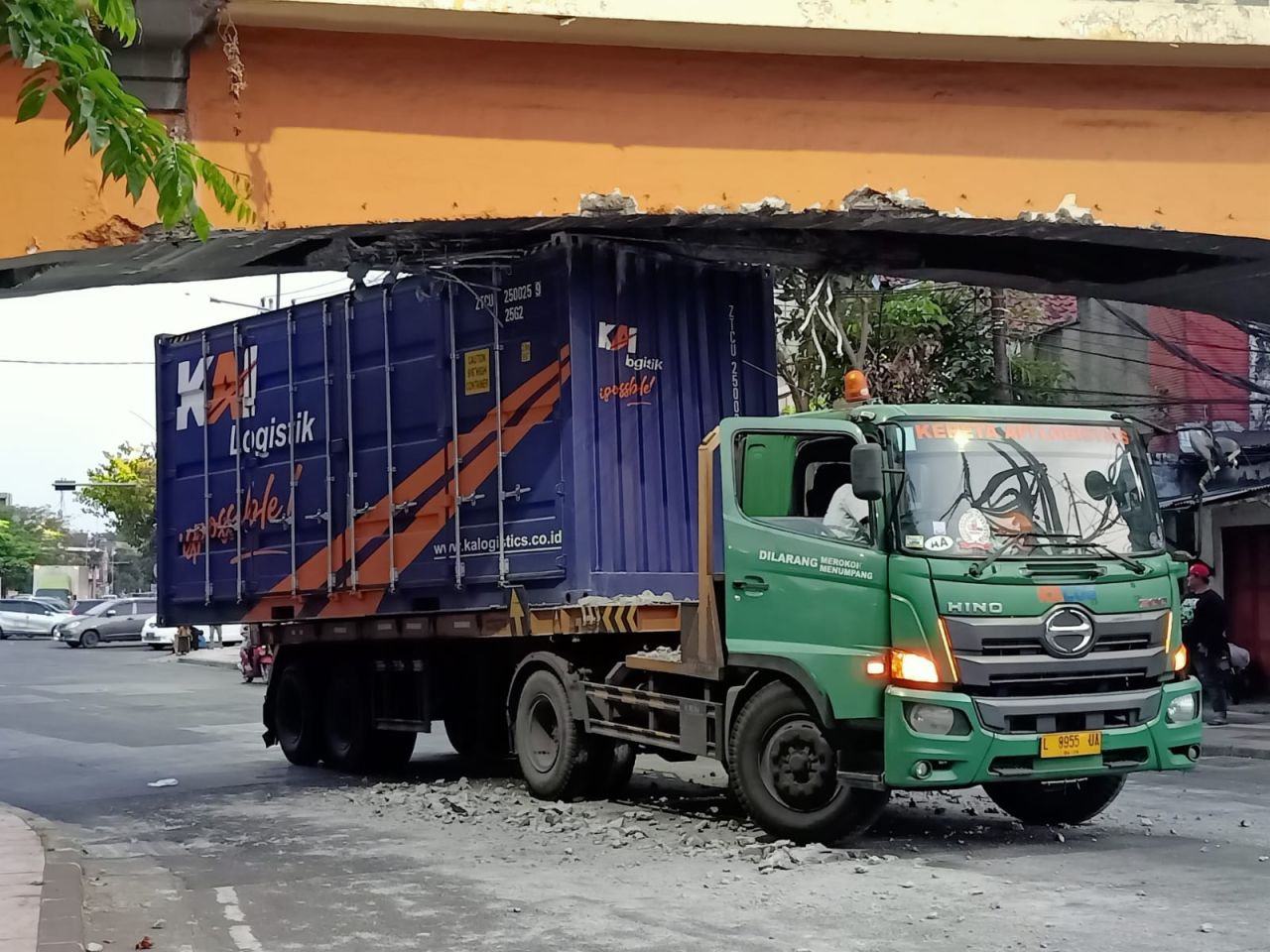 selalu.id - Sebuah truk kontainer logistik KAI yang melintasi bawah viaduk atau jembatan kereta api yang terletak di Jalan Bubutan depan Tugu Pahlawan, tersangkut hingga menyebabkan beberapa kerusakan, Jumat (30/6/2023).