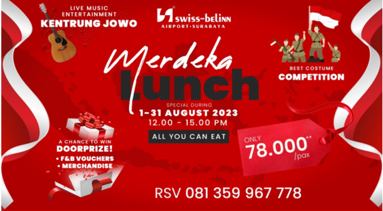 “Tidak hanya suasana dan kuliner khas nusantara, tetapi Merdeka Lunch juga menawarkan kesempatan memenangkan berbagai doorprize menarik dan juga kompetisi kostum terbaik untuk memeriahkan kemerdekaan kali ini,” jelas Alessandro Mulya, Public Relation Swiss-Belinn Airport Surabaya.