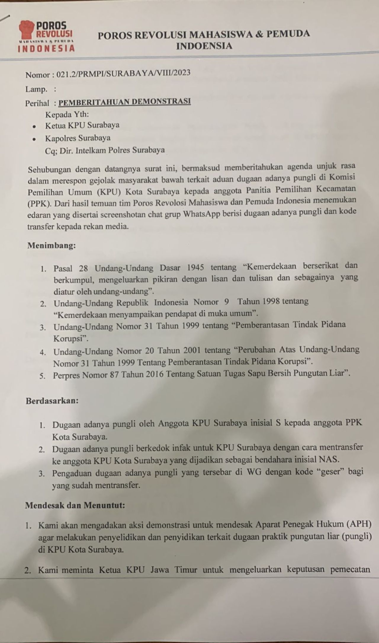Rencana aksi tersebut tertulis dalam surat pemberitahuan demonstrasi Nomor : 021.2/PRMPI/SURABAYA/VIII/2023 untuk Ketua KPU Surabaya dan Kapolres Surabaya.