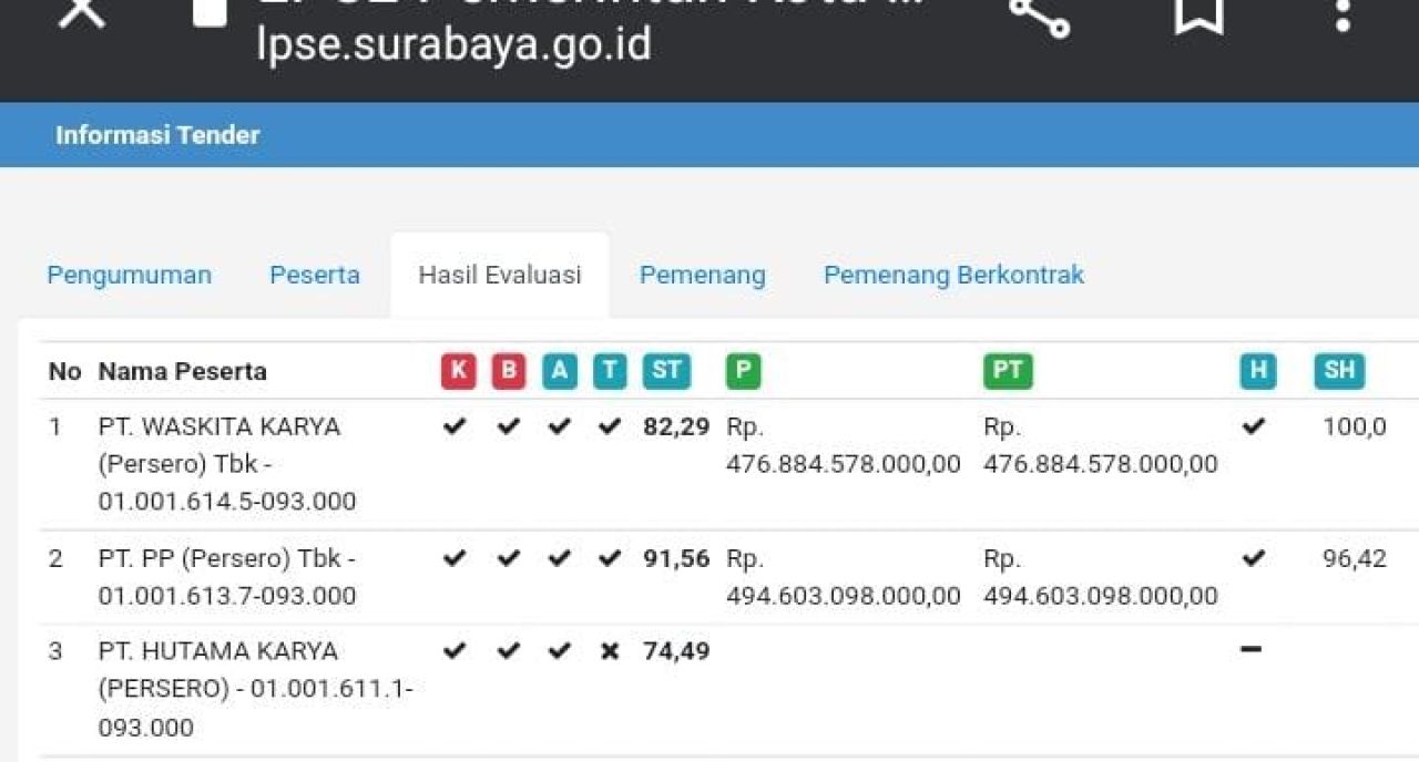 Diketahui berdasarkan hasil pemenang lelang pada 24 Agustus 2023 lalu, melalui LPSE itu pada peringkat pertama adalah PT PP dengan pengajuan penawaran sebesar Rp 494.603.098.000,00. Sedangkan, peringkat kedua yakni PT Waskita Jaya senilai Rp 476.884.578.000,00.
