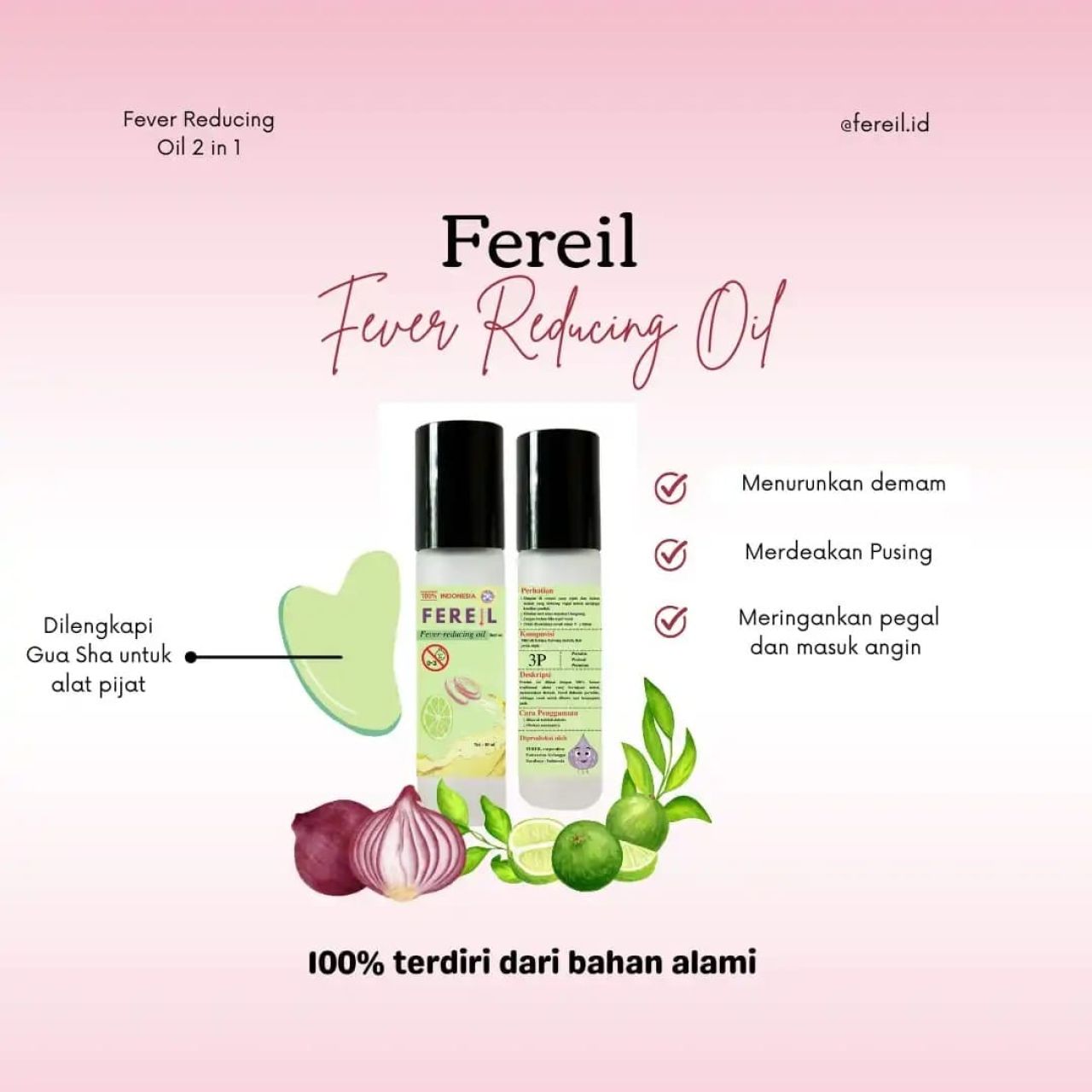Dalam satu set Fereil bisa 2 in 1, dengan beberapa kelebihan yakni bisa dioleskan pada dahi dan pelipis untuk mengurangi demam, pusing, atau pun saat masuk angin. Selain itu, dilengkapi dengan alat untuk kerokan di leher atau punggung.